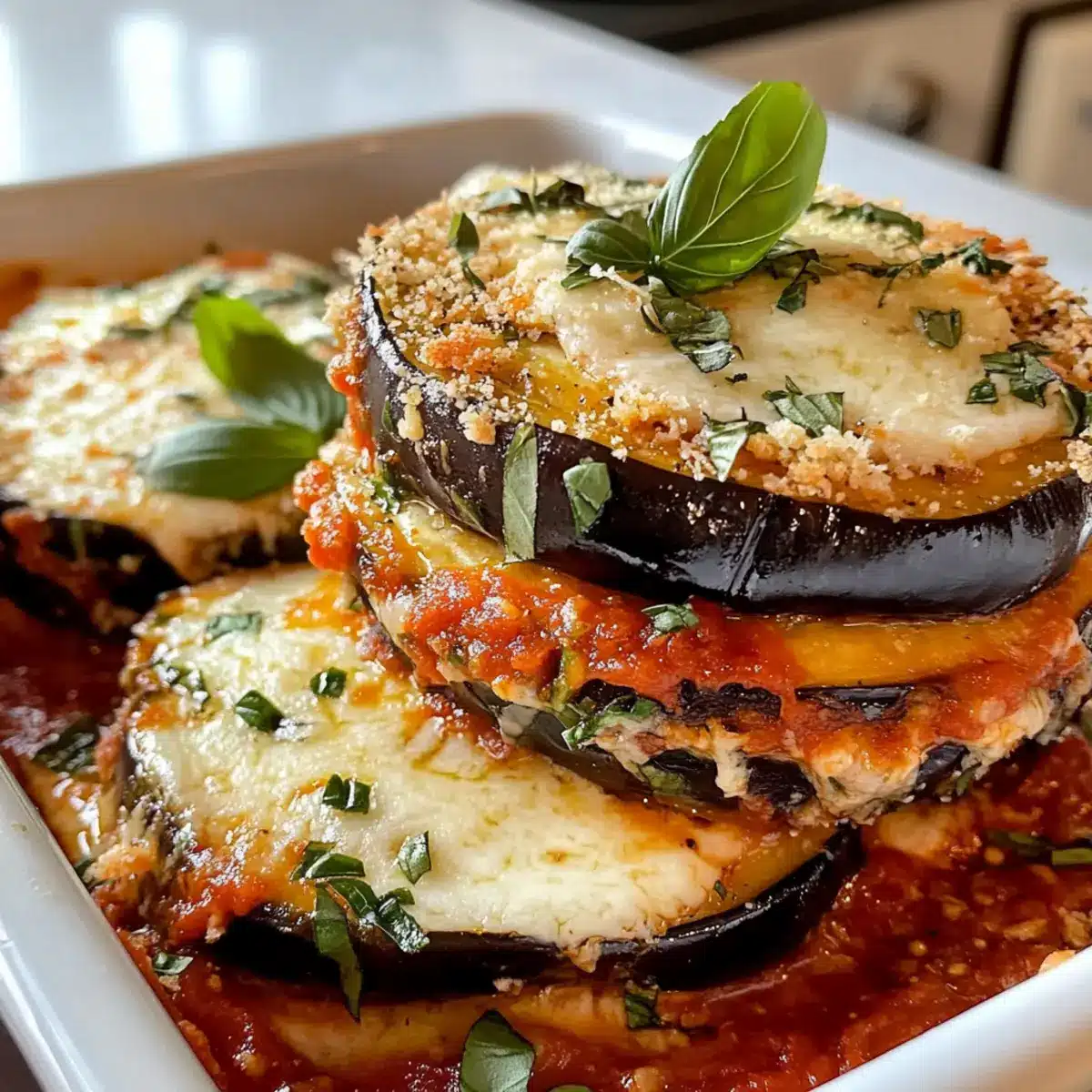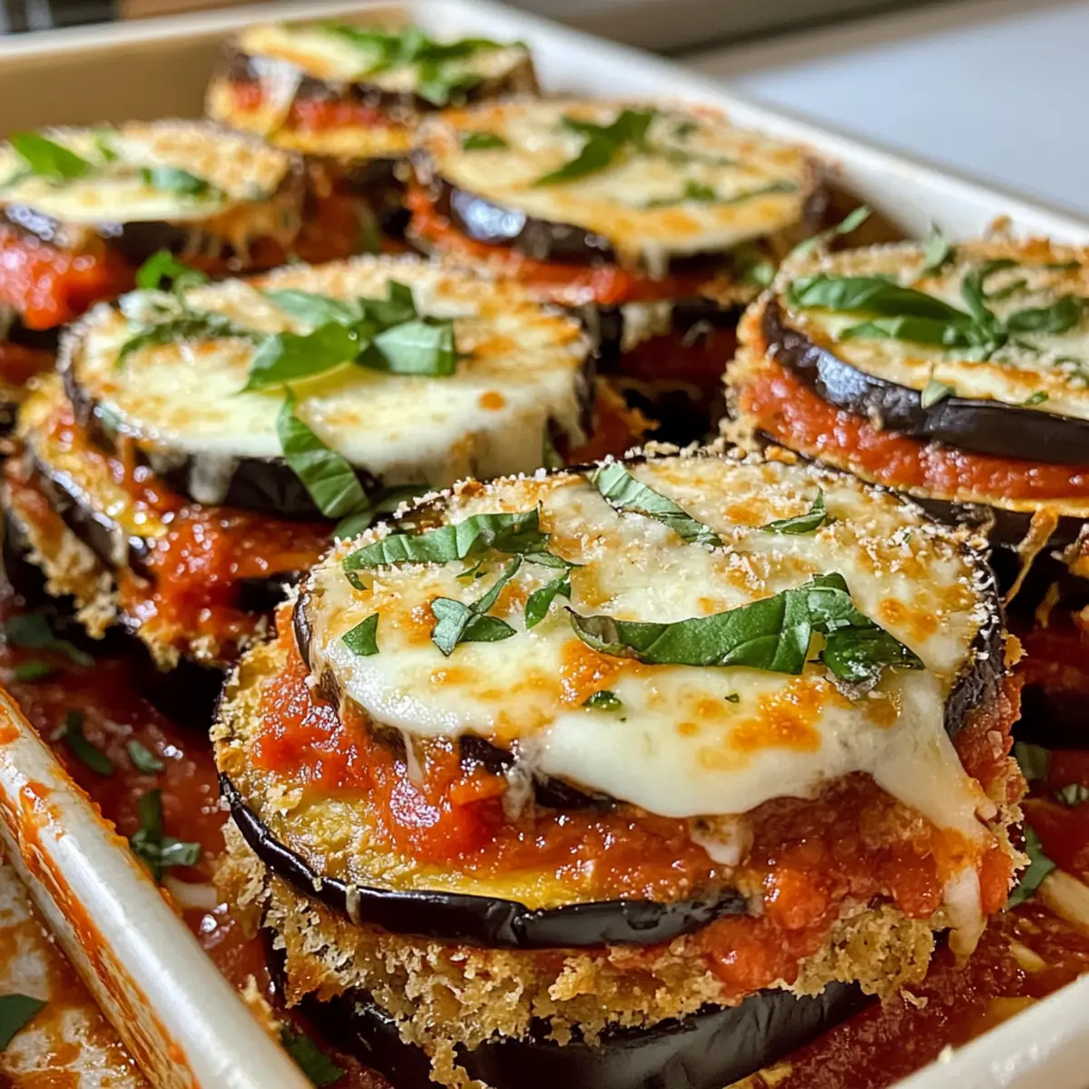 Backe die Auberginen-Parmesan-Stapel bei 200 °C für 20–25 Minuten, bis der Käse geschmolzen und blubbernd ist. Achte darauf, dass die Oberseite goldbraun wird; dies ist das Zeichen für den perfekten Genuss.