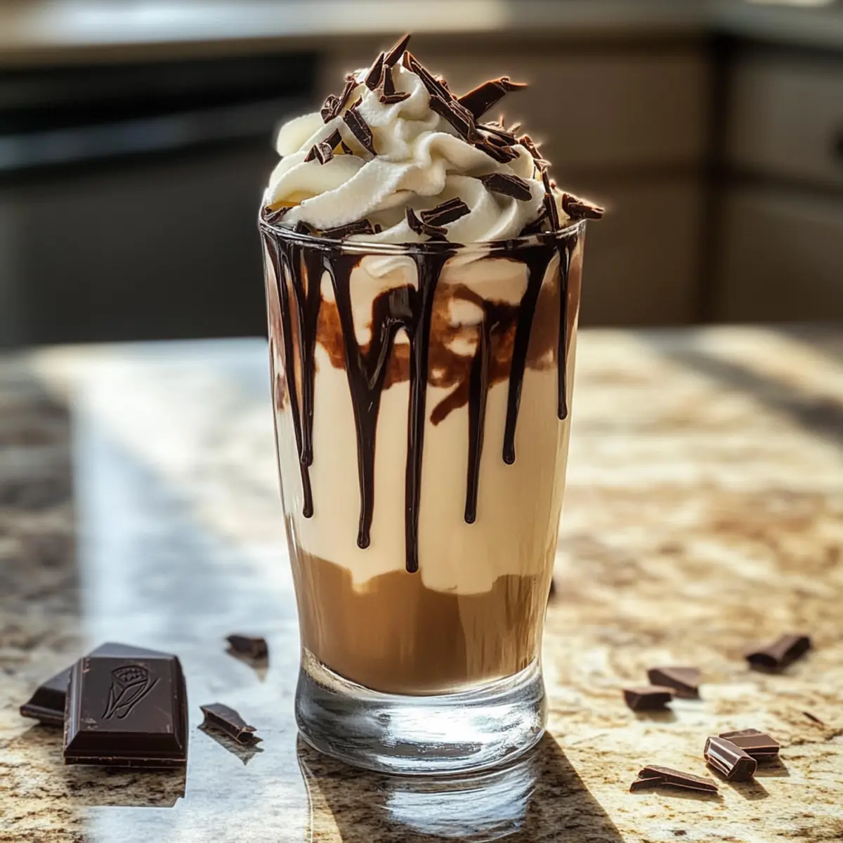 - Nimm das vorbereitete Glas aus dem Gefrierschrank und gieße die Mischung vorsichtig hinein. Garniere mit Schlagsahne und Schokoladensirup.