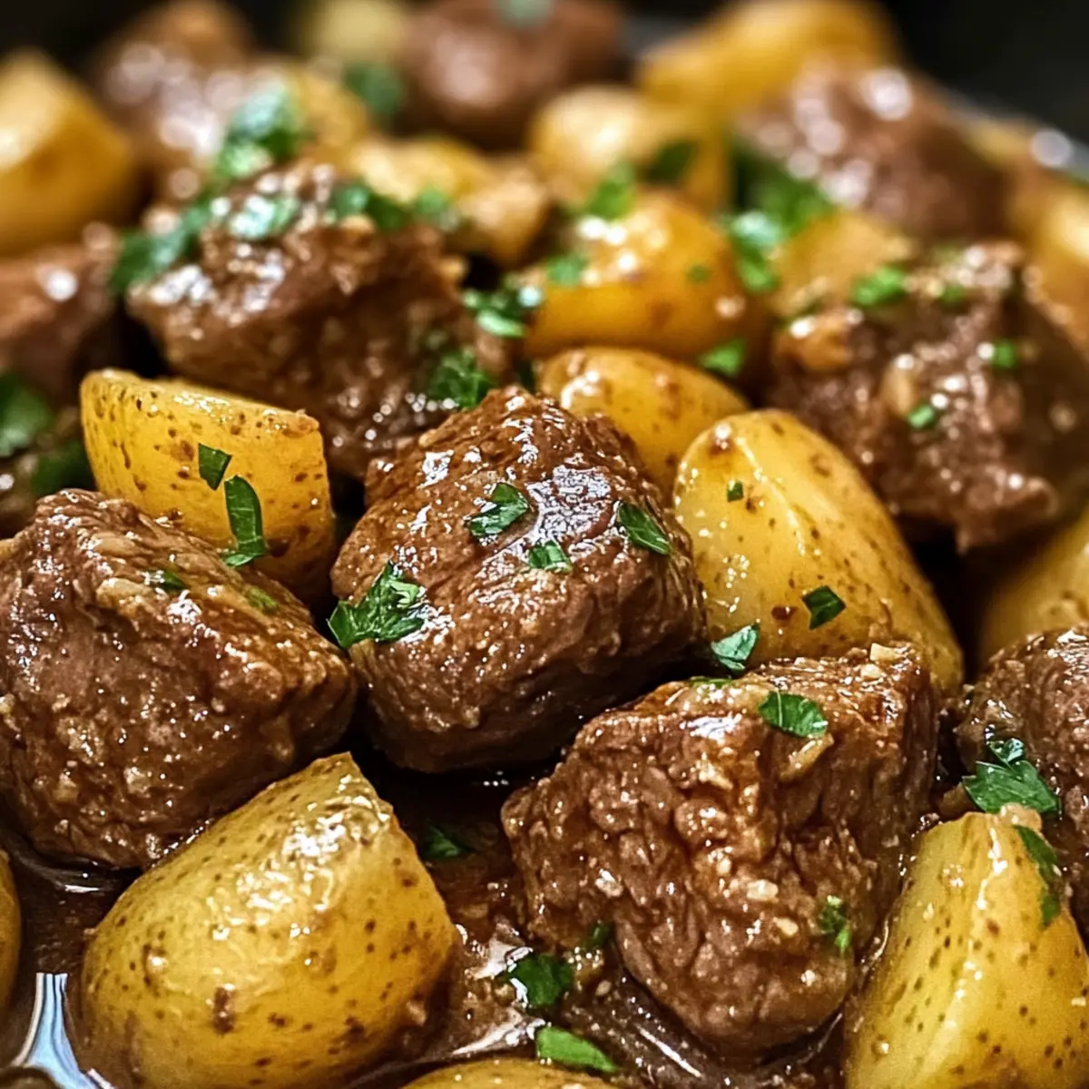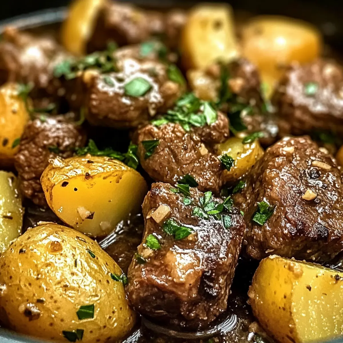 Legen Sie die halbierten Baby-Kartoffeln und das angebratene Rindfleisch in den Slow Cooker. Gießen Sie die vorbereitete Knoblauchbutter-Sauce gleichmäßig darüber und fügen Sie die Rinderbrühe hinzu. Achten Sie darauf, dass alles gut verteilt ist, damit die Aromen gleichmäßig in die Butter Rindfleisch Häppchen eindringen können.