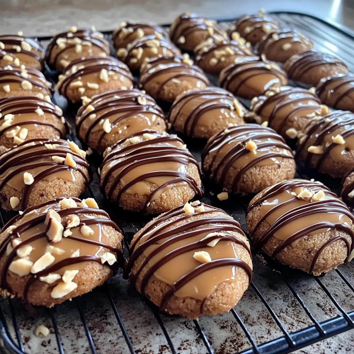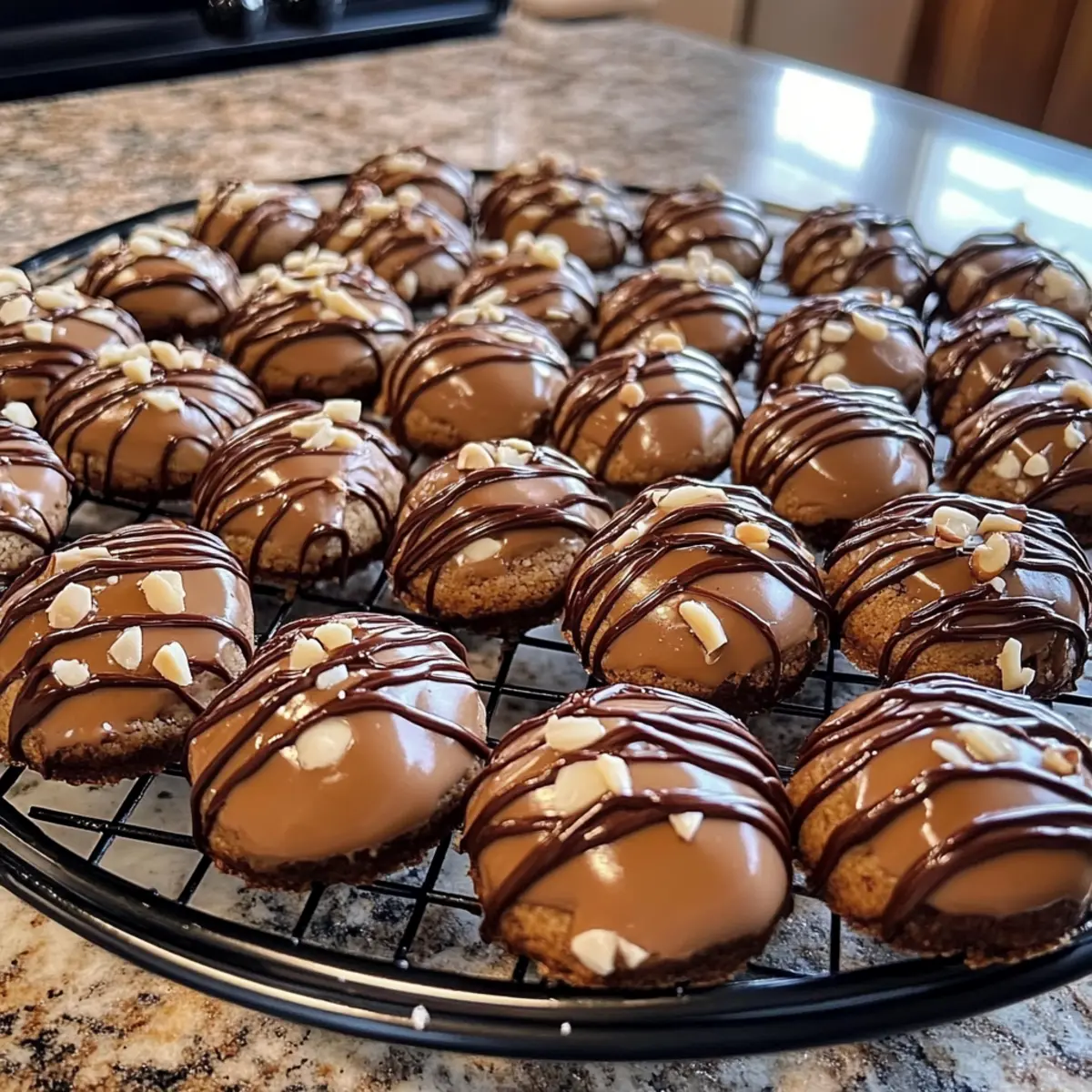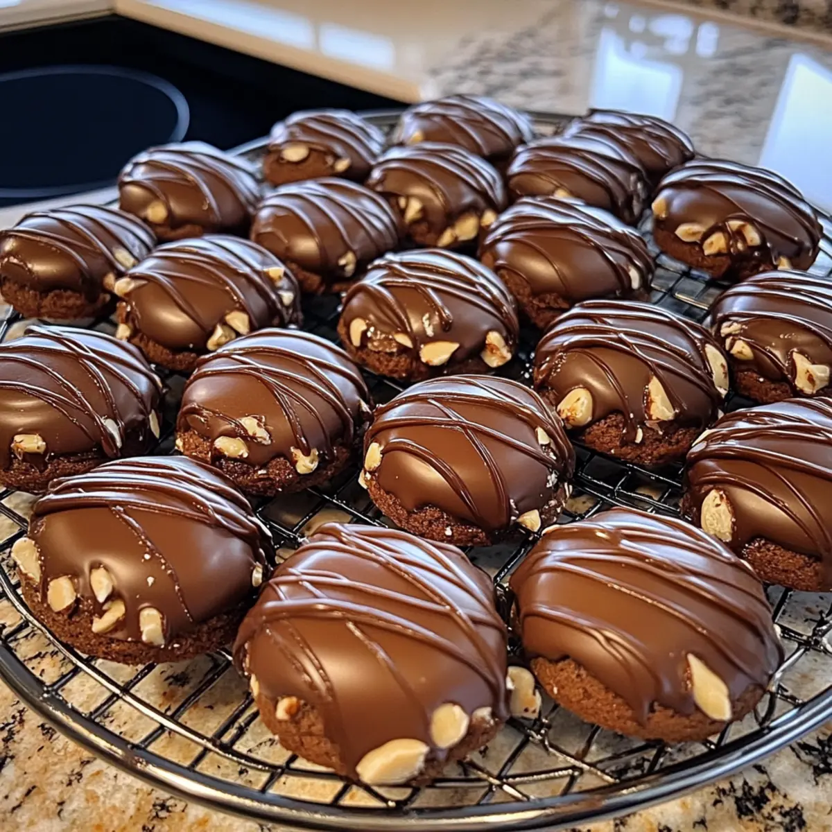 - Lass die Kugeln auf dem Blech kurz abkühlen und setze sie dann auf ein Kuchengitter, um vollständig auszukühlen. Glasieren mit Haselnuss- und Schokoladenglasur.