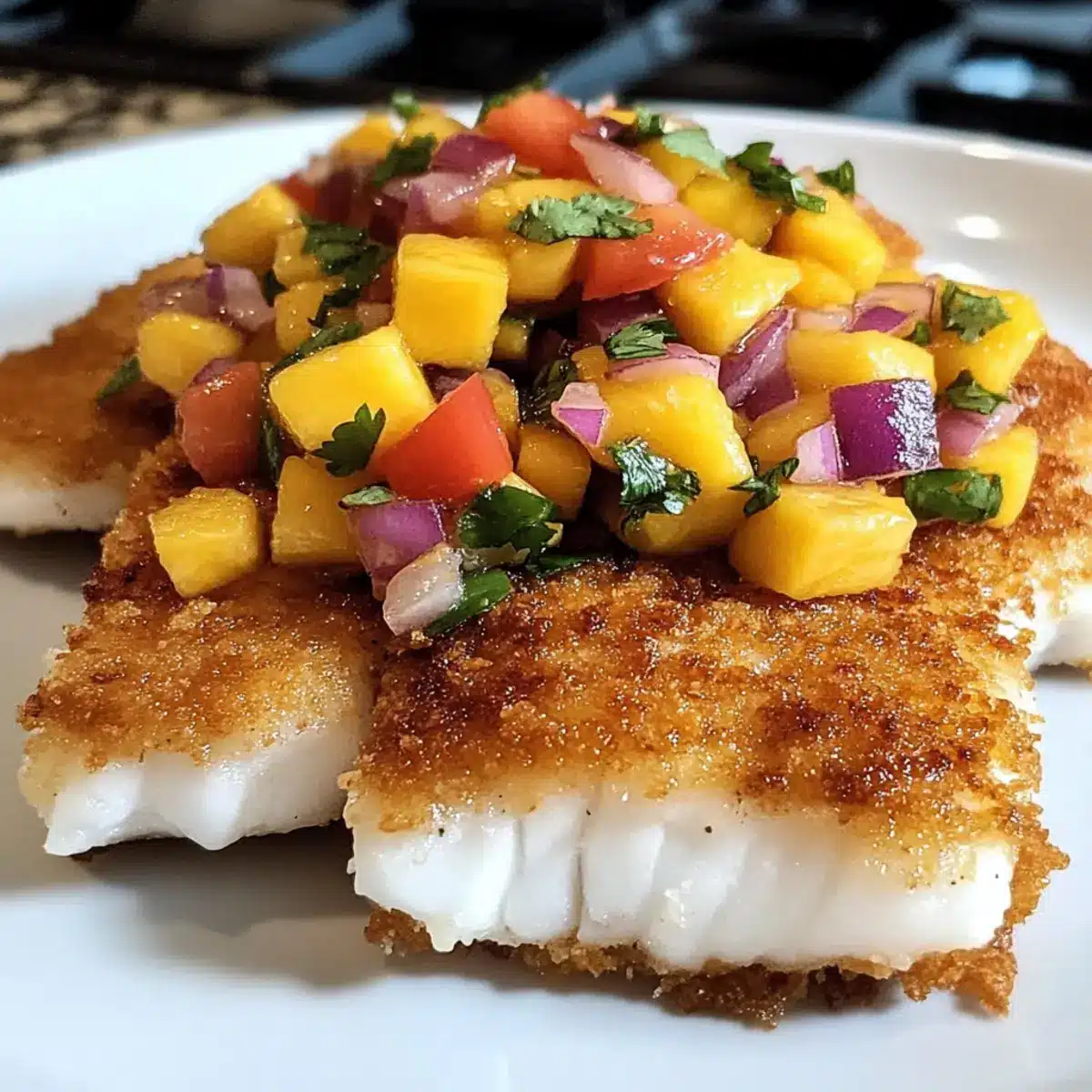 Kokosnusskruste Fisch mit frischer Mangosalsa