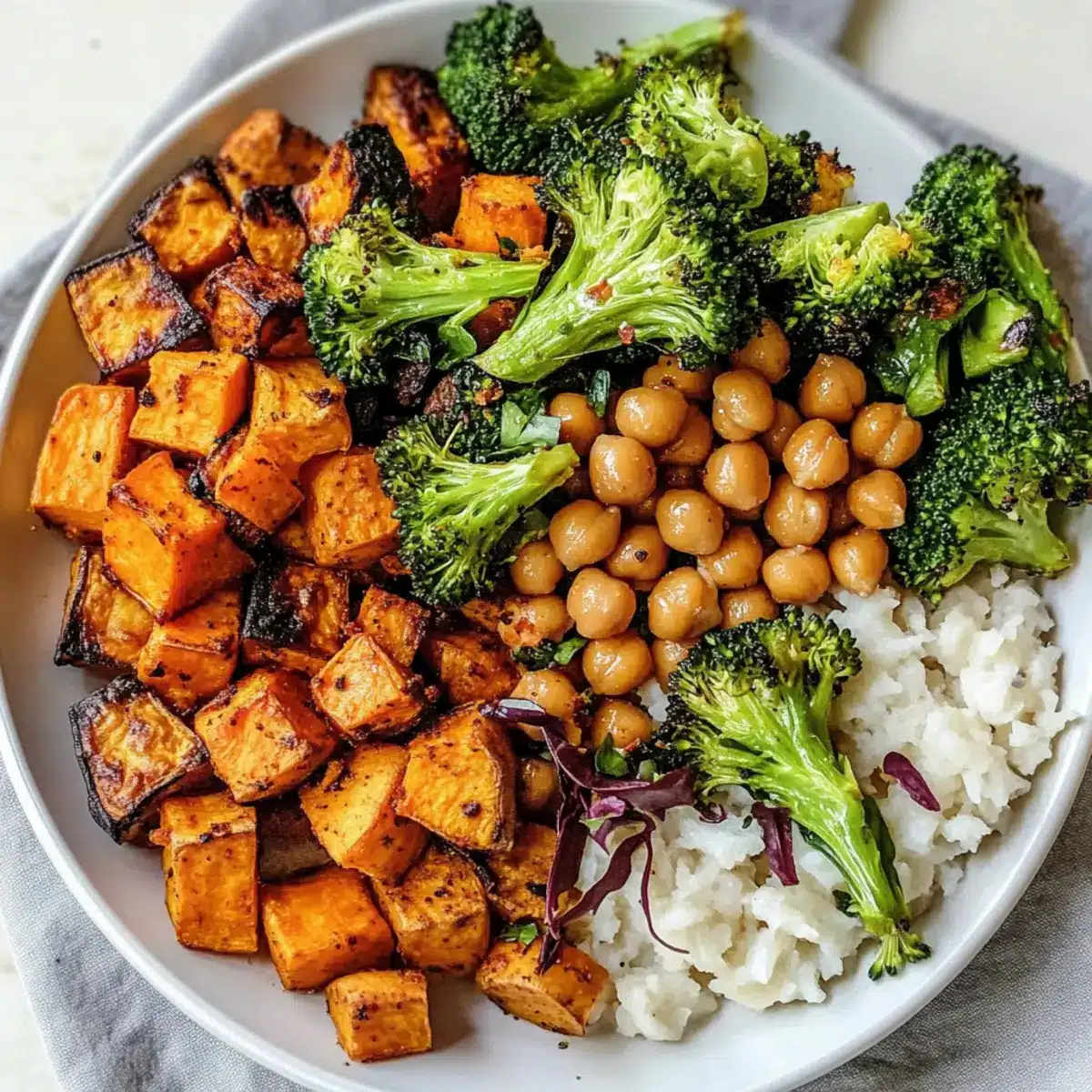 Süßkartoffel und Kichererbsen im Ofen glänzen