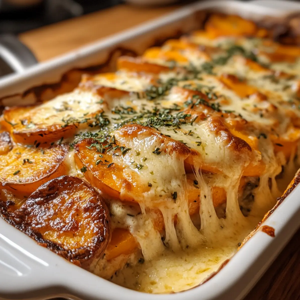 Knoblauch überbackene Süßkartoffeln mit cremiger Sauce