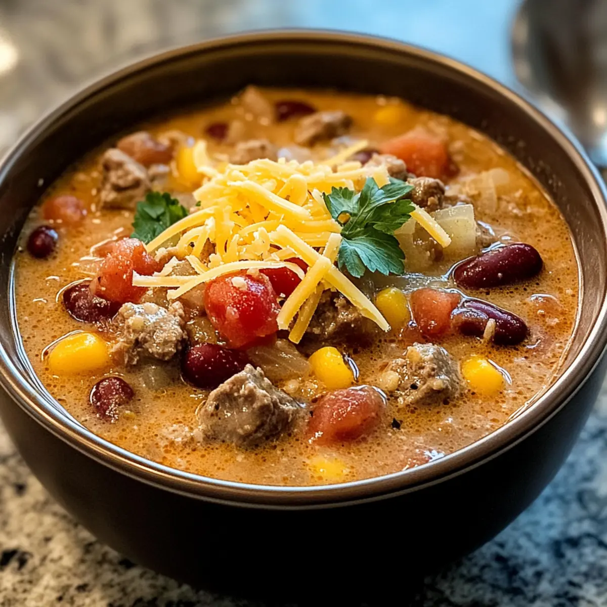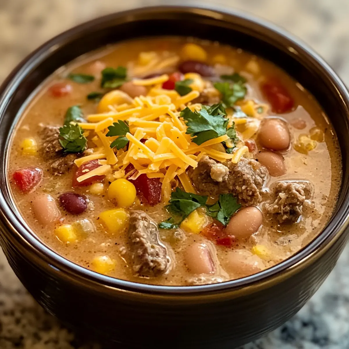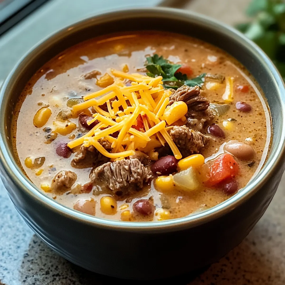 - Serviere die cremige Cowboy Suppe heiß, garniert mit geriebenem Cheddar-Käse und frischem Koriander oder Petersilie, wenn gewünscht.