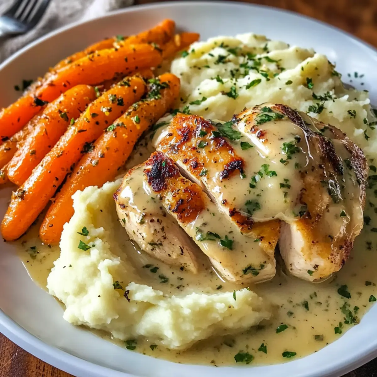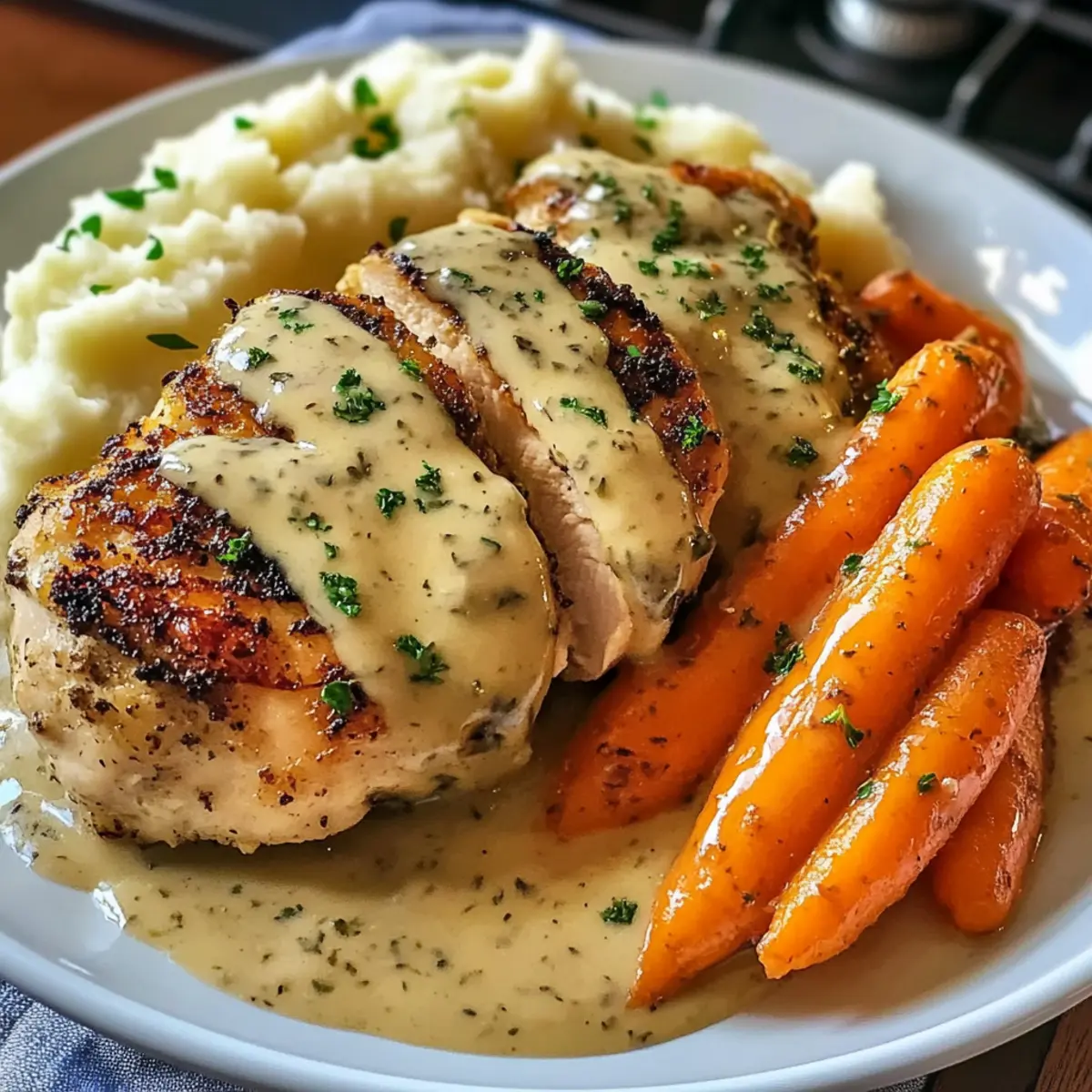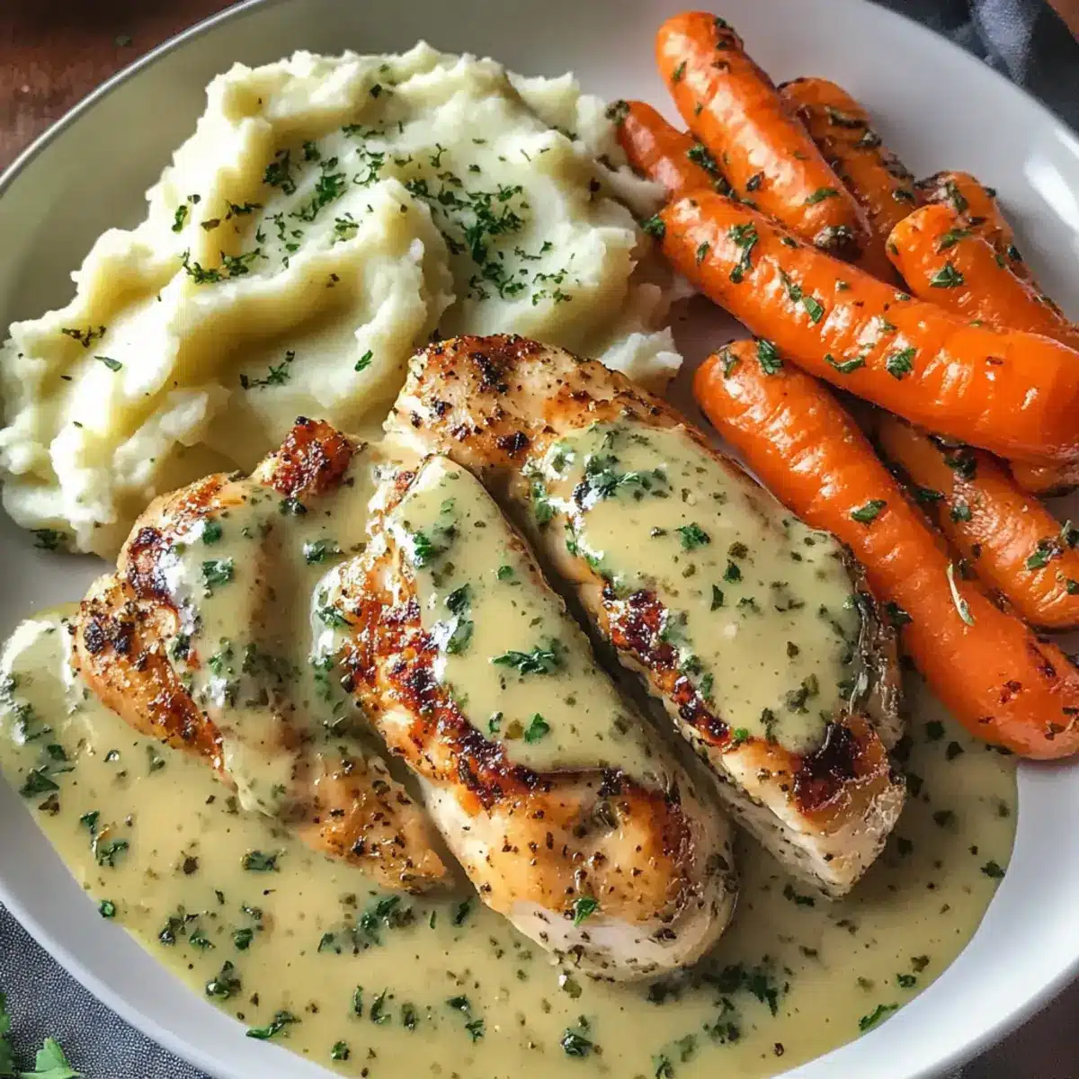 Verteile den warmen Kartoffelbrei großzügig auf Tellern. Lege die Hähnchenbrust darauf und löffele die cremige Kräutersauce darüber. Garnieren die Teller mit den glasierten Karotten an der Seite für ein wunderbares Familienessen, das jeden begeistert.