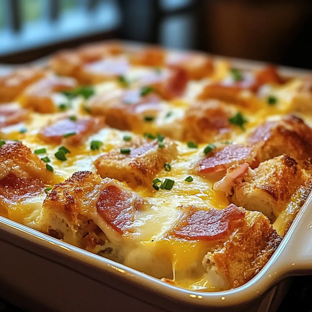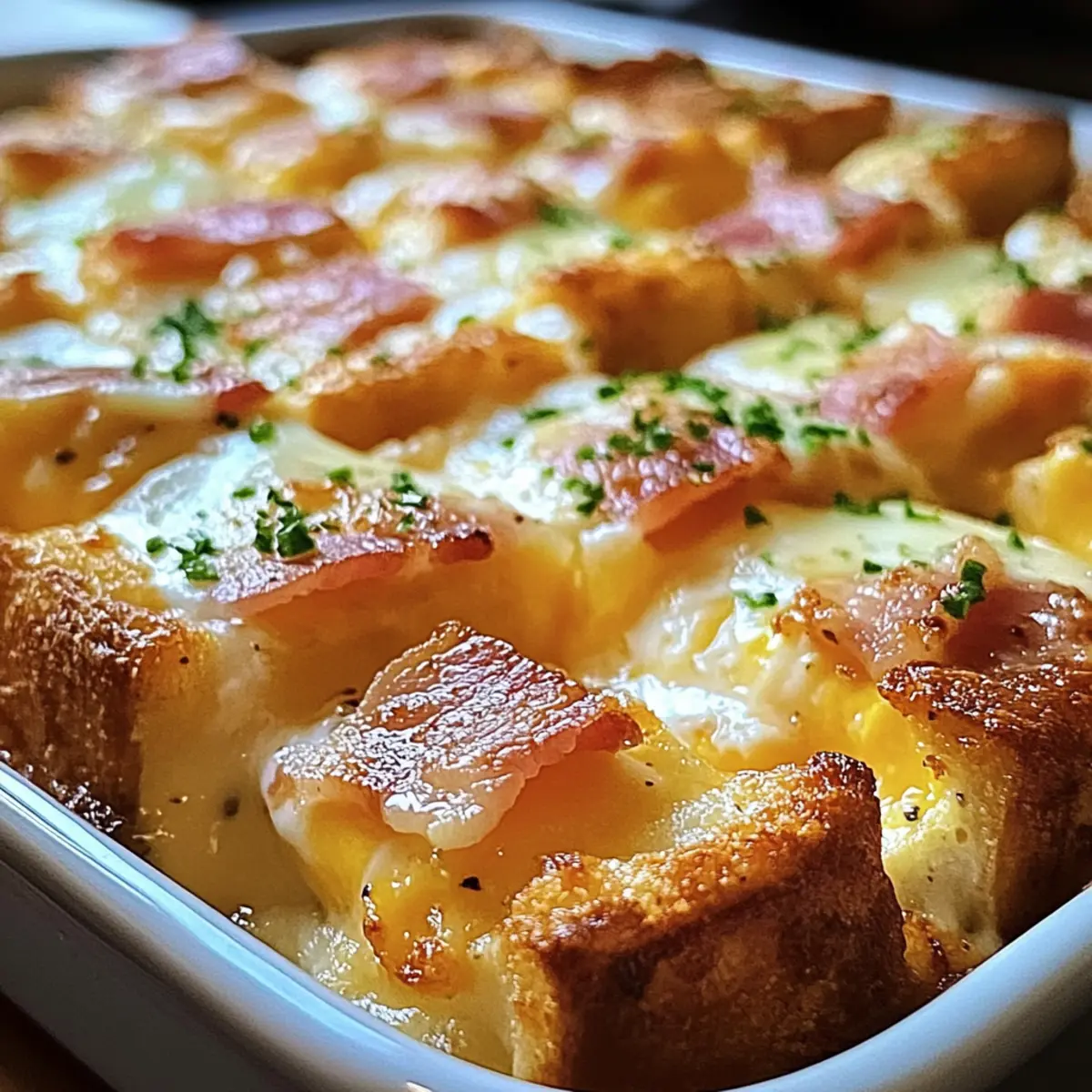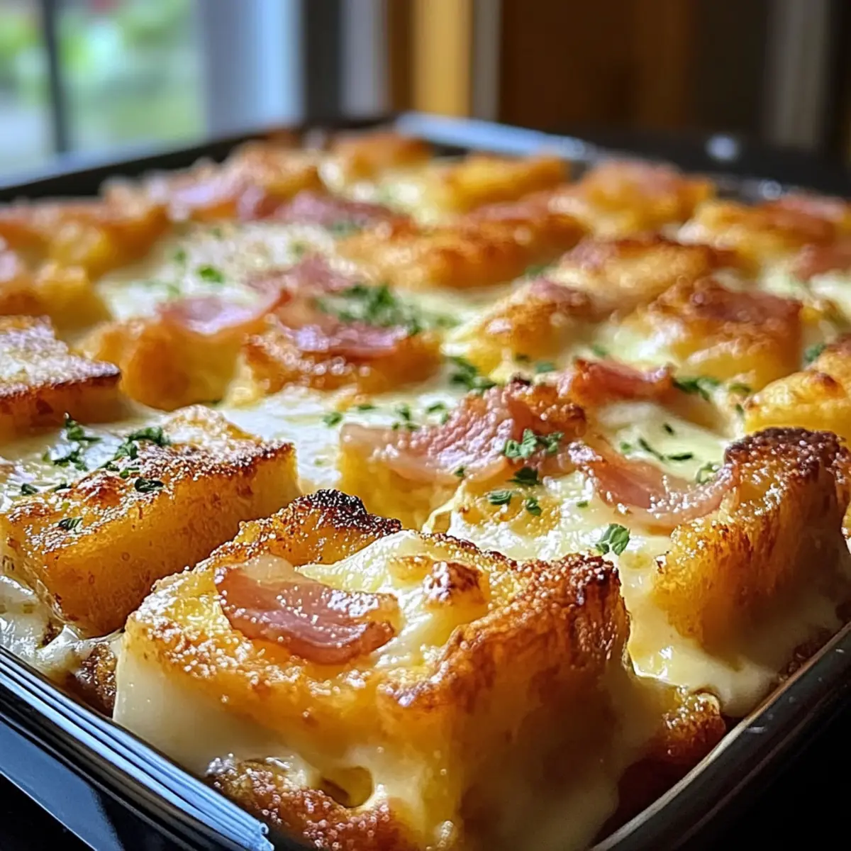 - Schichte die Muffinwürfel, den Speck und die Eiercreme in die Backform.