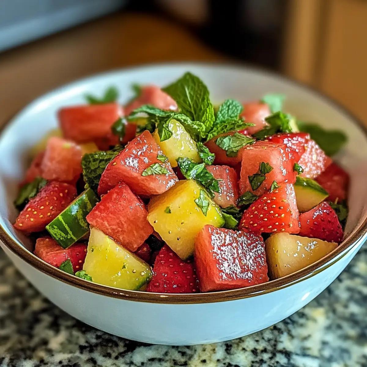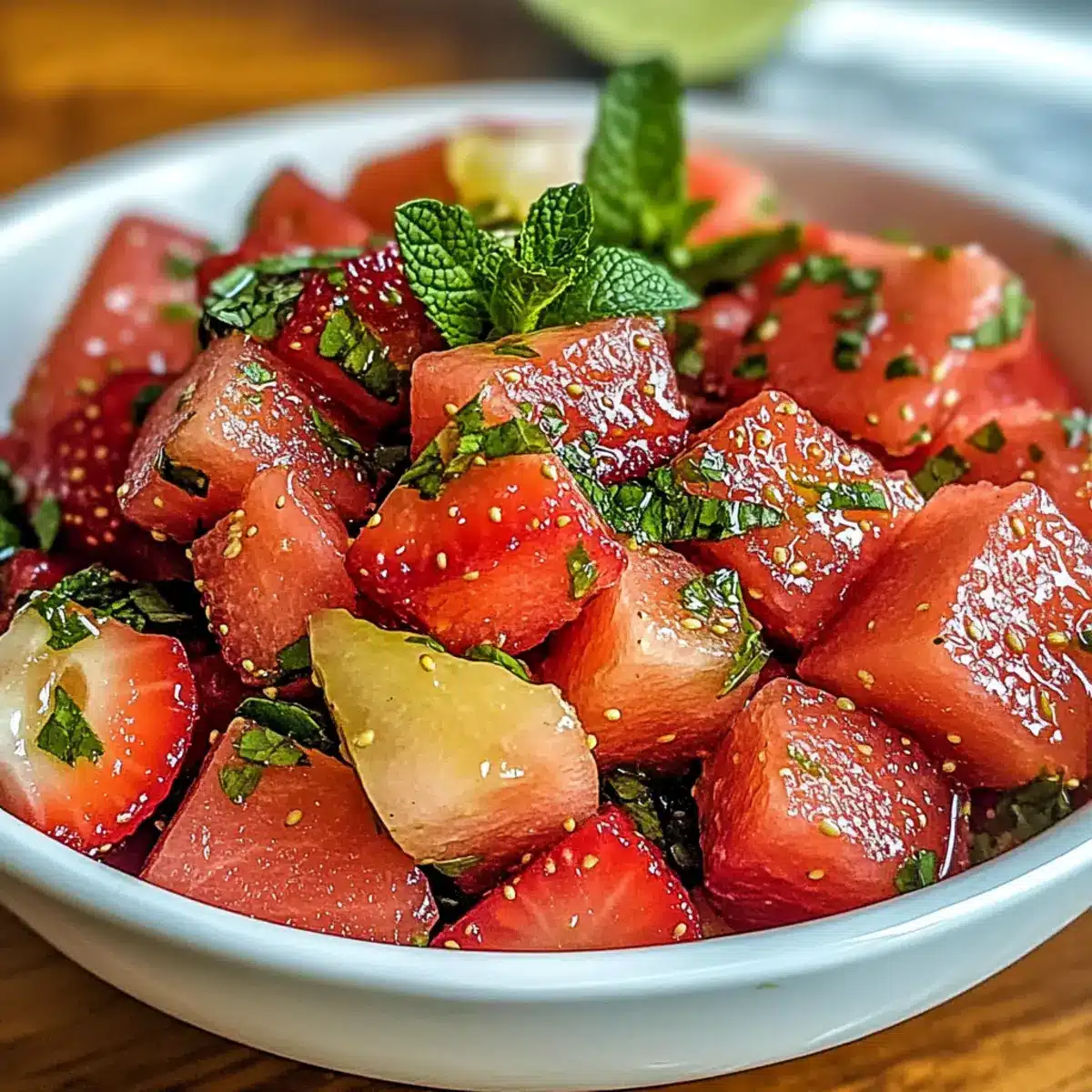 • Variationen ausprobieren: Experimentieren Sie mit frischen Kräutern wie Basilikum oder Zitronenverbene für unterschiedliche Geschmacksrichtungen in Ihrem Erdbeere Wassermelone Salat.