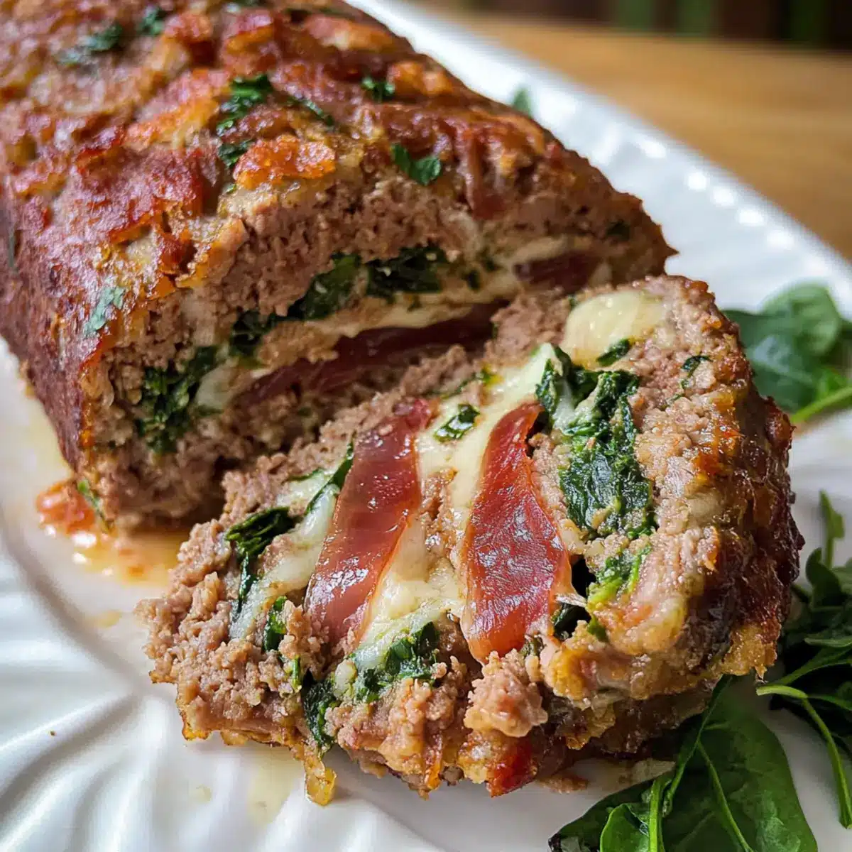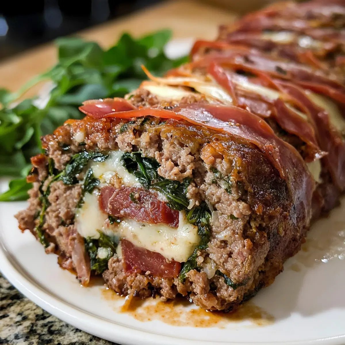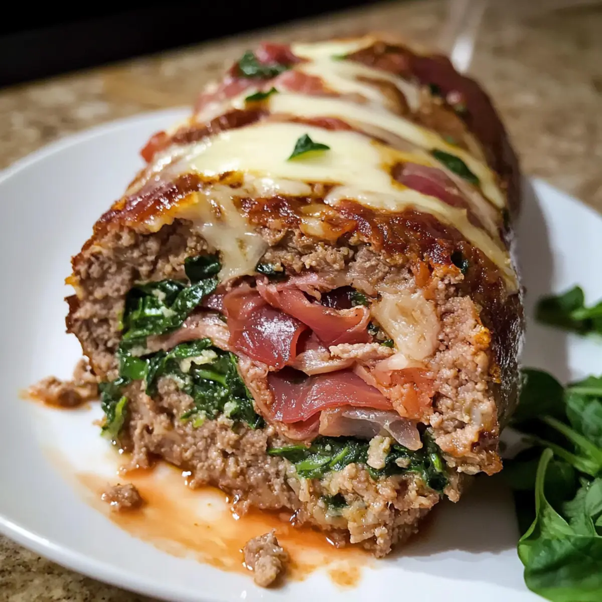 - Lege den frischen Spinat, den Prosciutto und den Provolone-Käse gleichmäßig auf die Fleischmasse.