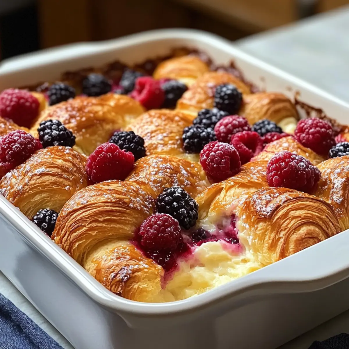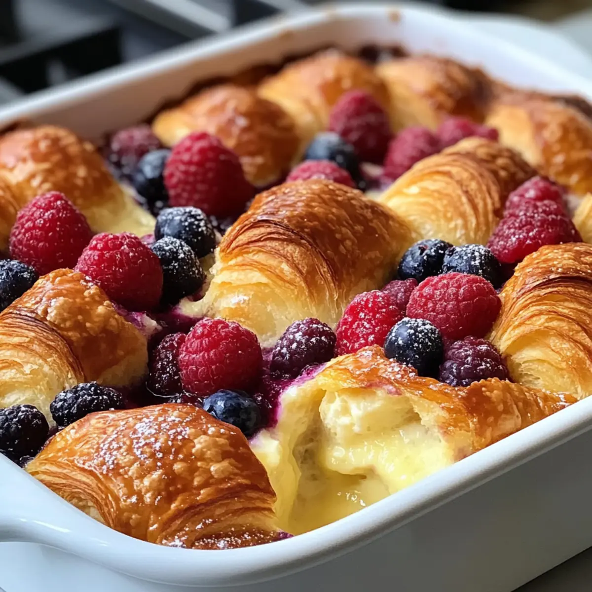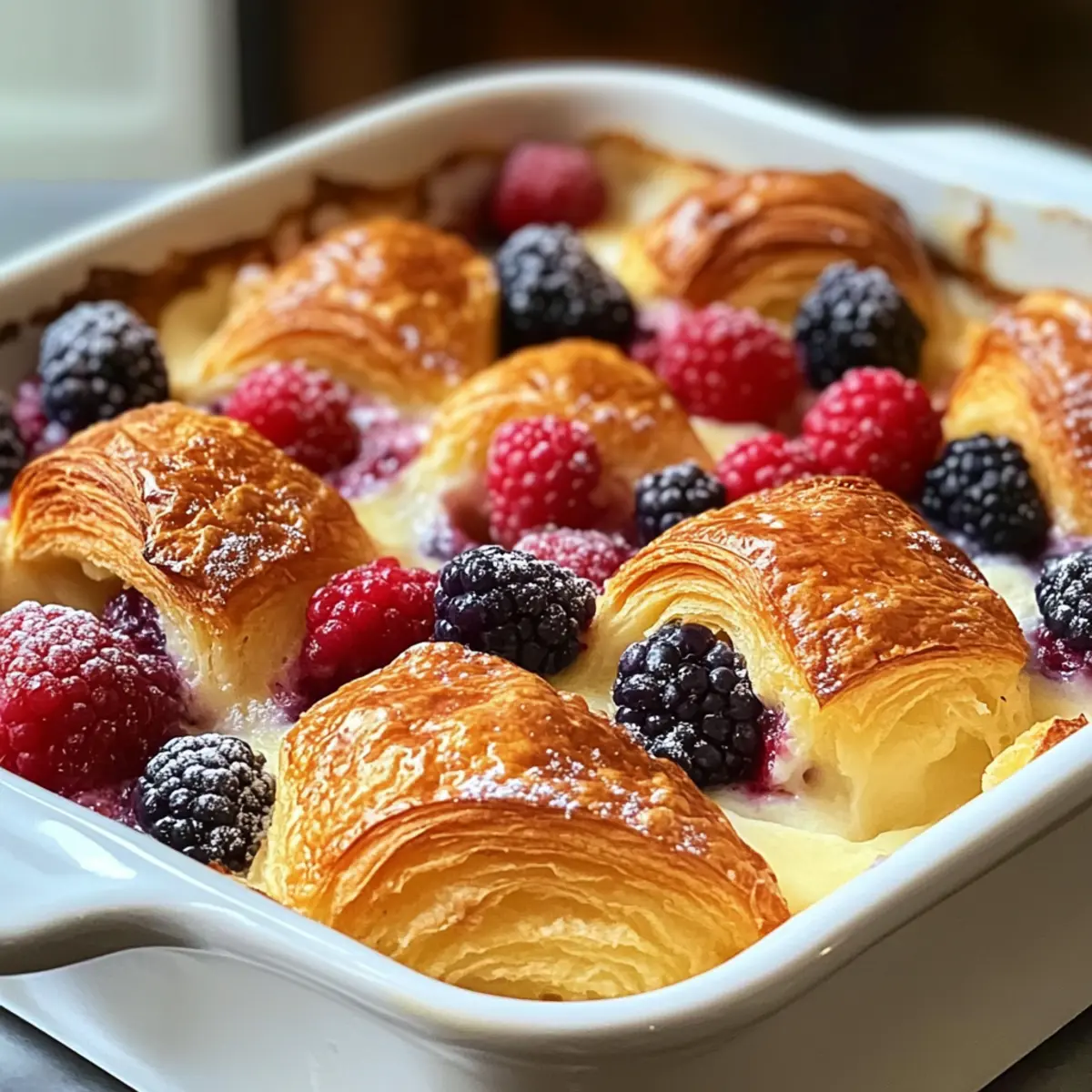 - Custard-Mischung gleichmäßig über die Croissants und Beeren gießen.