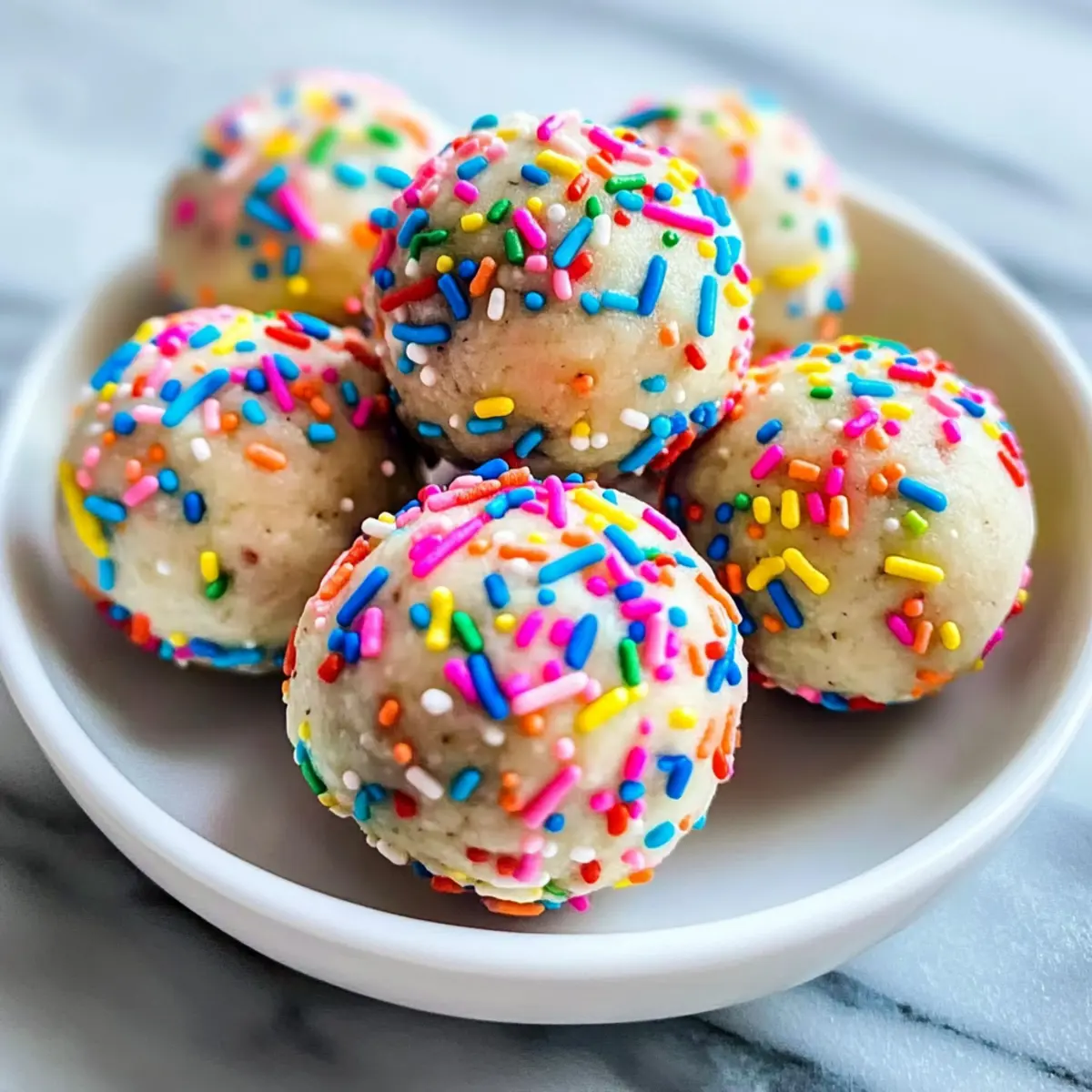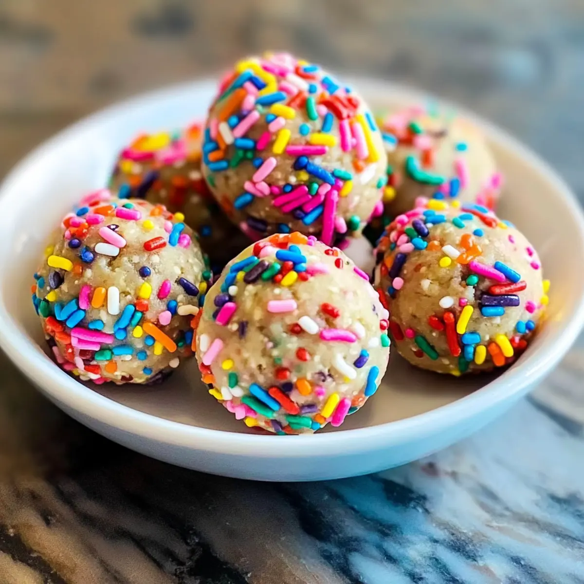 Nimm eine kleine Schüssel mit den bunten Streuseln und rolle jedes Bällchen darin, bis es rundum mit Streuseln bedeckt ist. Dies verleiht deinen Geburtstagskuchen Proteinbällchen nicht nur ein herrliches Aussehen, sondern sorgt auch für zusätzlichen Geschmack. Achte darauf, dass die Streusel gleichmäßig verteilt sind.