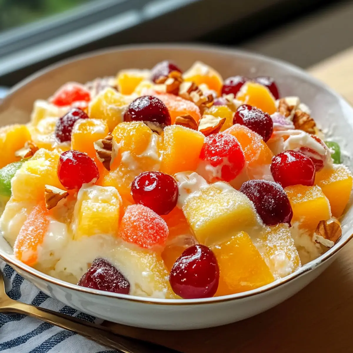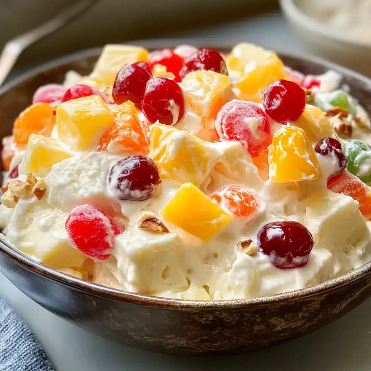 - Falte die abgetropfte, zerstoßene Ananas, die Mandarinen, die Kirschen und die optionalen gehackten Nüsse vorsichtig unter die cremige Basis.