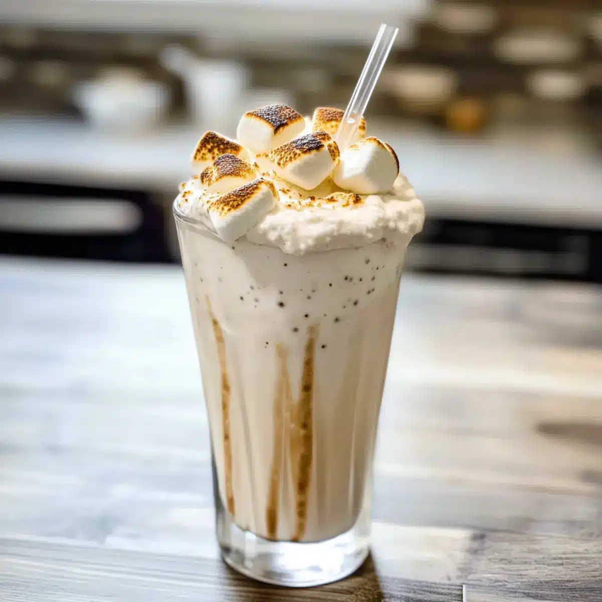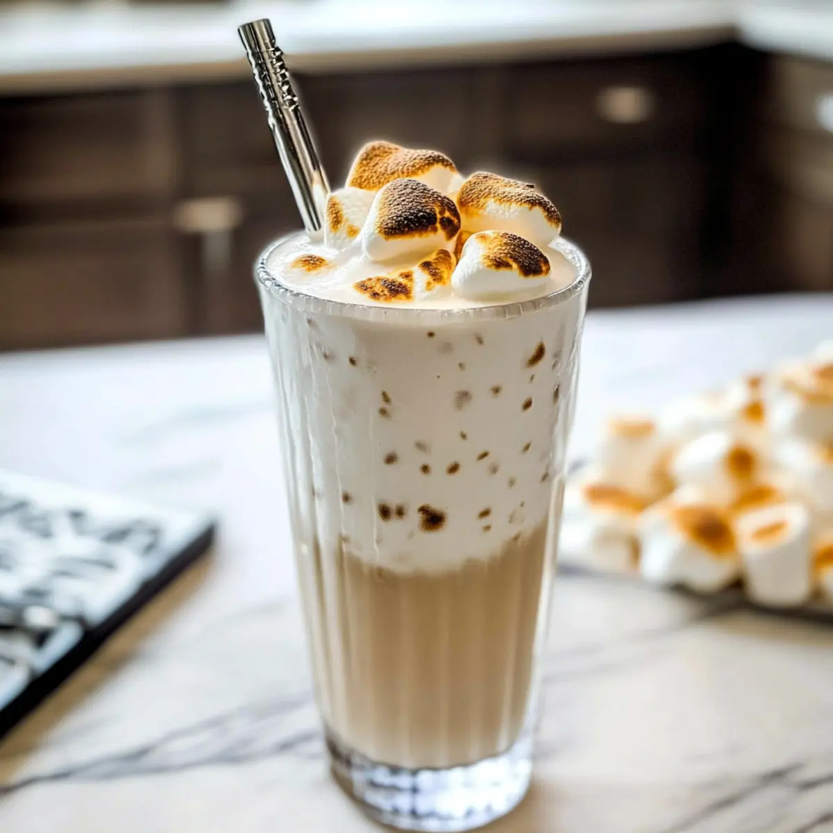 Nostalgie pur: Dieser geröstete Marshmallow-Milchshake weckt Erinnerungen an unbeschwerte Sommerabende um das Lagerfeuer, wo der süße Duft von gerösteten Marshmallows in der Luft lag.
