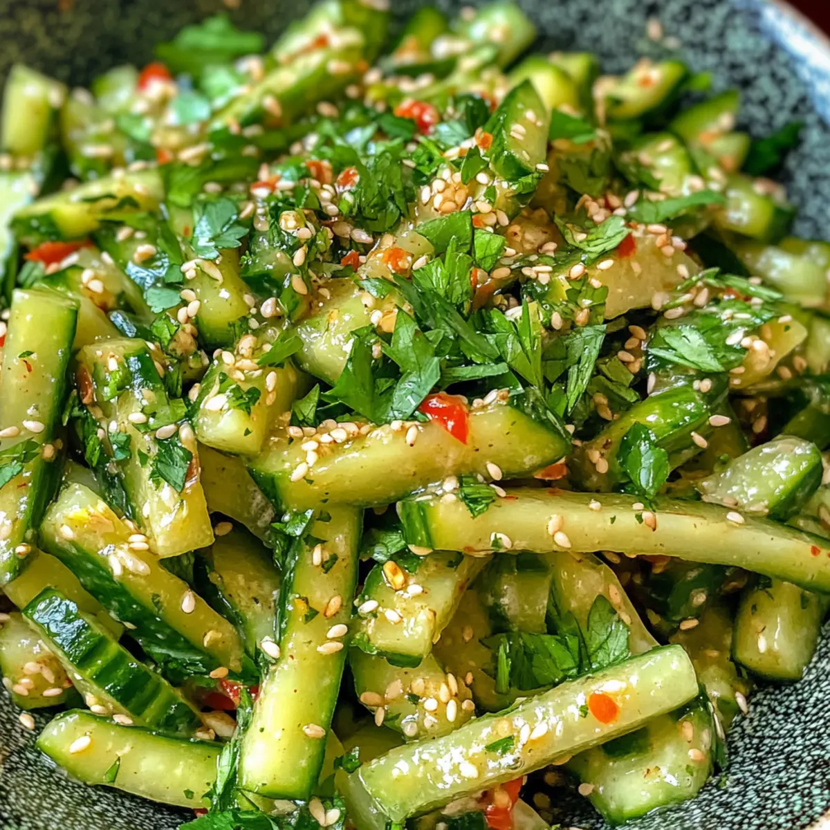 Falls gewünscht, garnieren Sie den Gurken Erdnussbutter Salat mit zusätzlichen Sesamsamen oder frischen Kräutern. Dies sorgt für eine ansprechende Präsentation und zusätzliche Textur. Genießen Sie jeden Bissen als erfrischende Beilage oder als leichtes Hauptgericht!