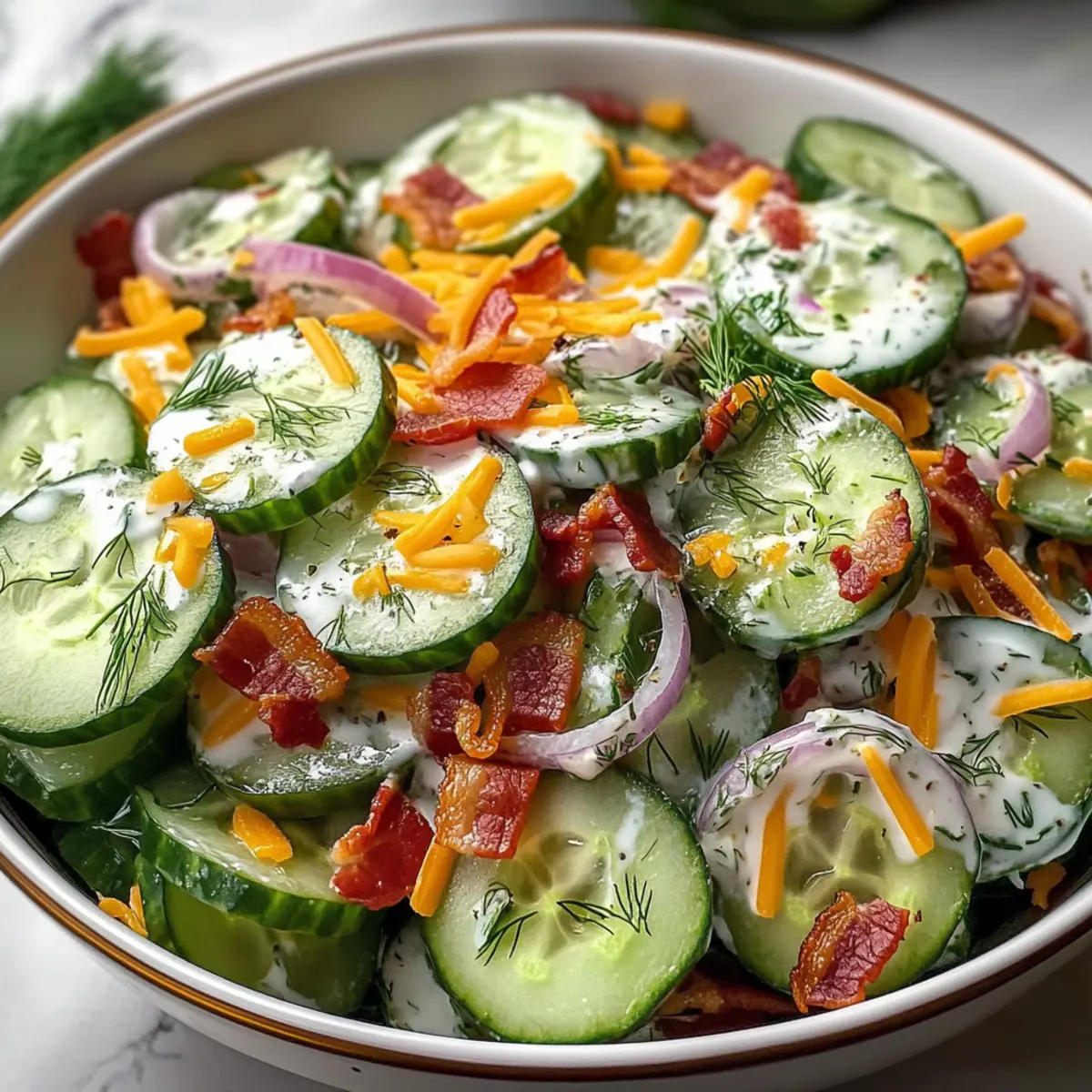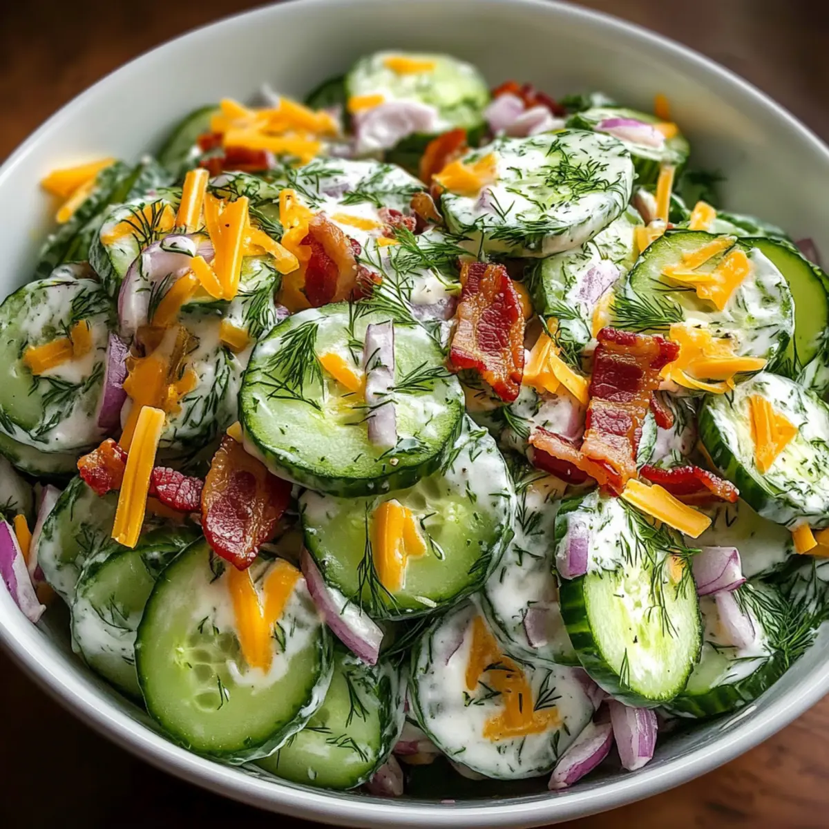 Gib die geschnittenen Gurken, den geriebenen Cheddar, die zerbröselten Speckstücke, die rote Zwiebel und den frischen Dill in eine große Schüssel. Verwende eine großzügige Schüssel, damit alle Zutaten ausreichend Platz haben, um leicht vermischt zu werden und ihre Aromen entfalten zu können.