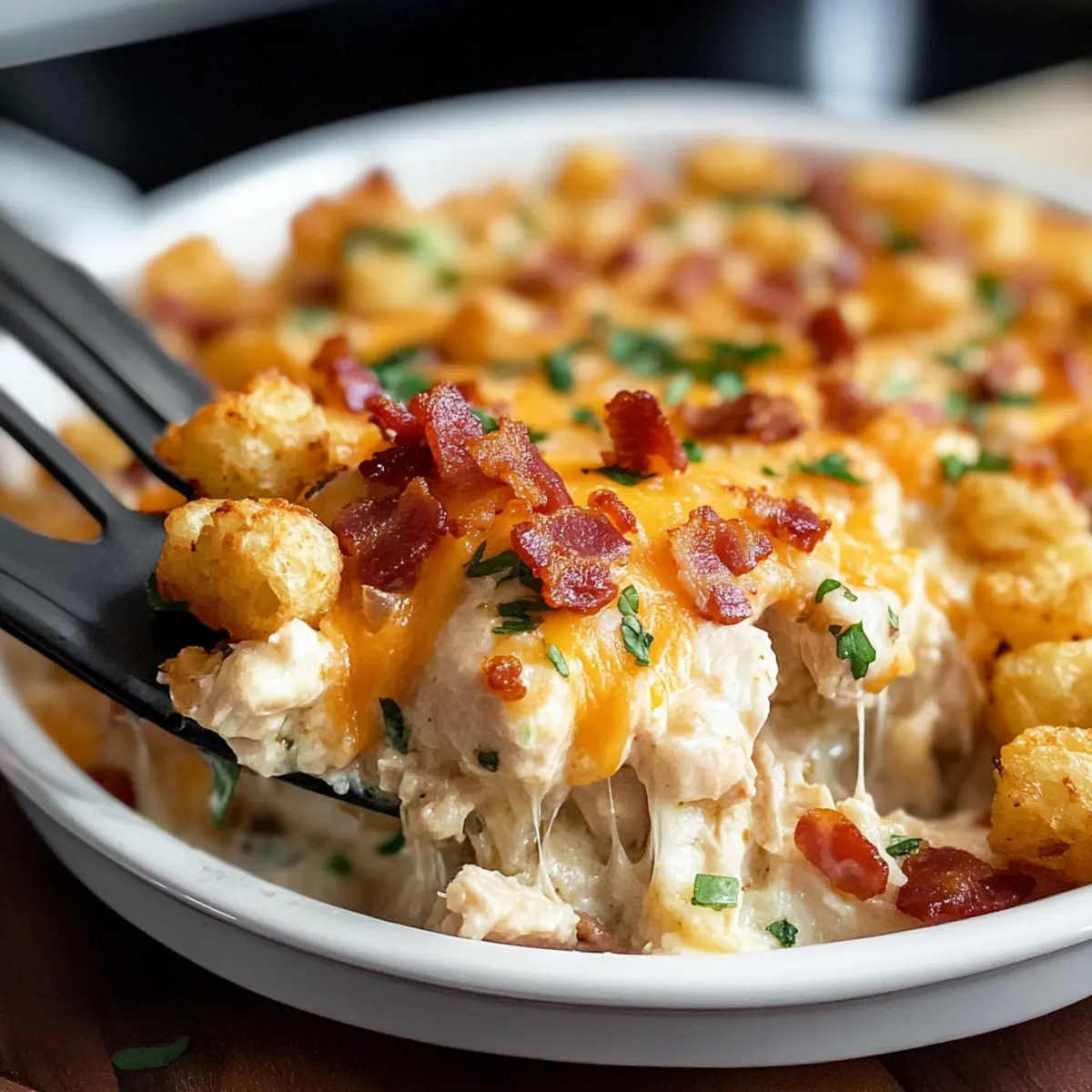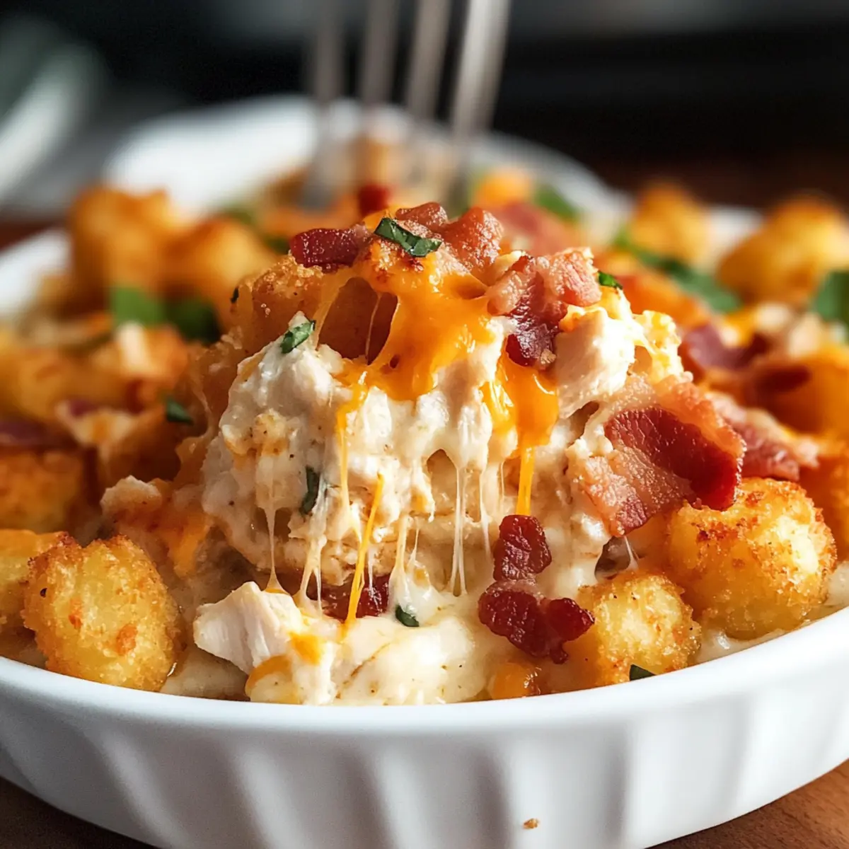 Für den besten Geschmack und die beste Textur empfehle ich, frische Hähnchenbrustfilets zu verwenden. Achte darauf, dass die Tater Tots „Extra Knusprig“ sind, um eine tolle Knusprigkeit zu gewährleisten. Bei der Auswahl des Bacons kannst du vorgegartes Bacon verwenden, um dir Zeit zu sparen.