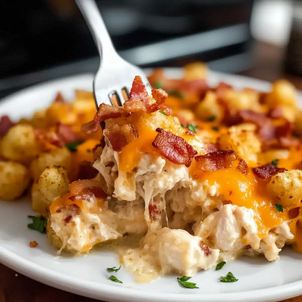 Für den Hähnchen Speck Ranch Auflauf kannst du viele Komponenten im Voraus zubereiten, um wertvolle Zeit zu sparen! Bereite den Bacon bis zu 3 Tage im Voraus zu und bewahre ihn im Kühlschrank auf, um ihn schnell verwenden zu können. Auch die Tater Tots lassen sich bis zu 24 Stunden vor dem Kochen schichten und in den Slow Cooker legen – einfach abdecken und kühl stellen. Am Tag des Servierens bringst du nur noch die restlichen Zutaten wie Hähnchen und Milch hinzu und stellst den Slow Cooker ein. Achte darauf, das Hähnchen gleichmäßig auf den Tater Tots zu verteilen, um eine optimale Garung zu gewährleisten. So genießt du eine schmackhafte und stressfreie Mahlzeit nach einem langen Tag!