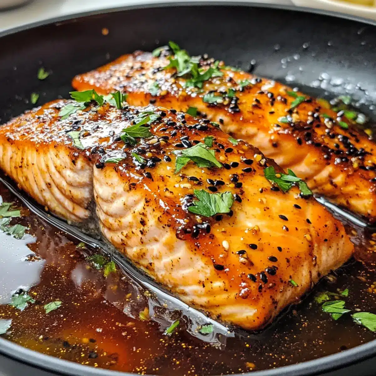 Gießen Sie die Honig-Buttersauce gleichmäßig über den seared Lachs in der Pfanne. Lassen Sie den Honigbutterlachs dann weitere 3-5 Minuten auf mittlerer Hitze garen. Schöpfen Sie regelmäßig die Sauce über die Filets, um sicherzustellen, dass sie gleichmäßig mit der aromatischen Mischung bedeckt sind und saftig bleiben.