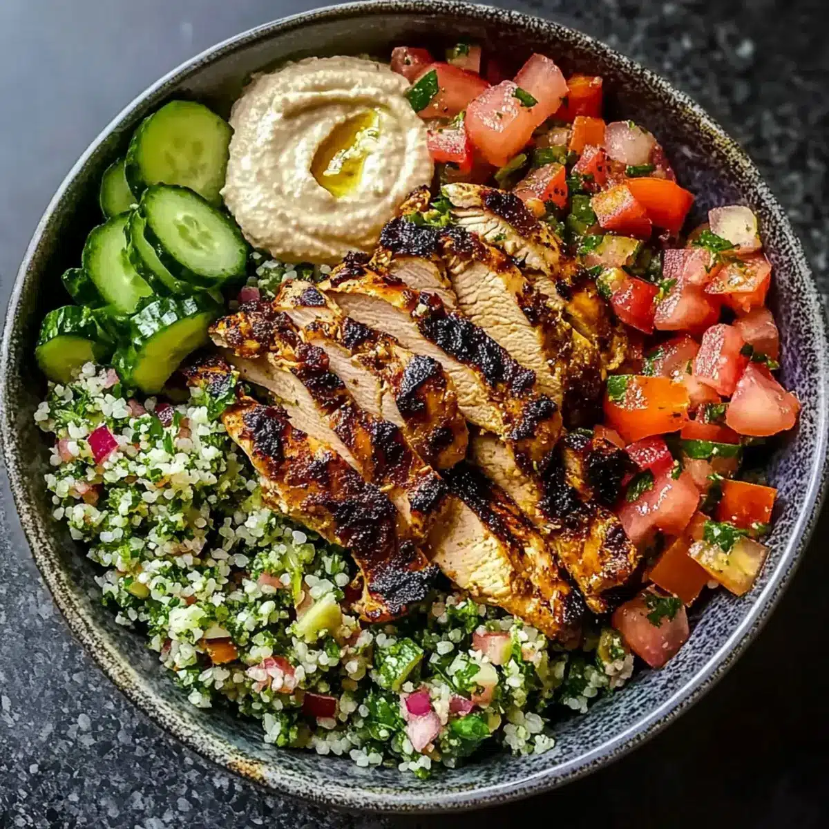 Die Kombination aus zartem Hühnchen und erfrischendem Tabbouleh schafft eine spannende Grundlage für ein köstliches Essensfest.