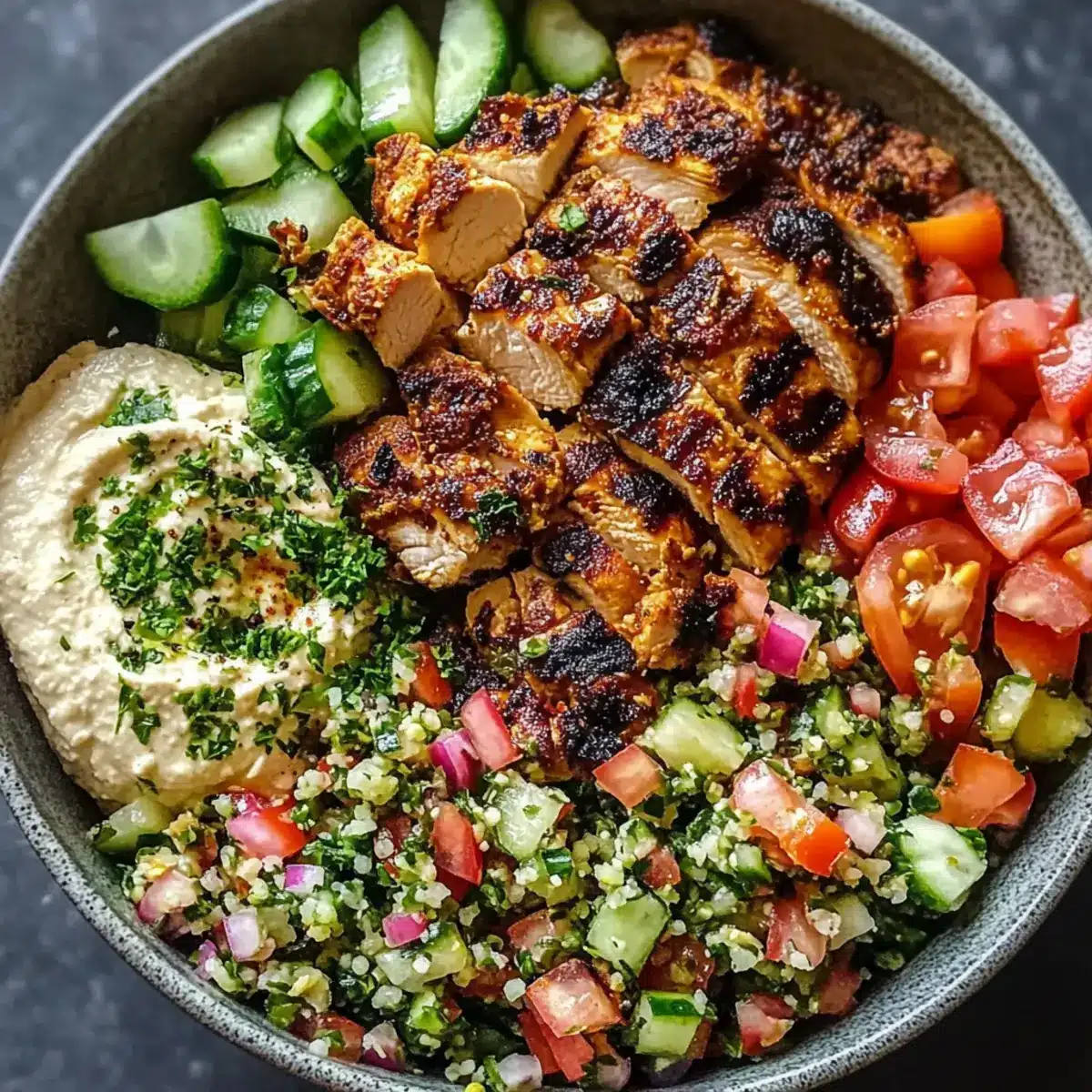 In einer großen Schüssel platziere eine großzügige Portion Tabbouleh als Basis. Lege die geschnittenen Hühnchenstreifen darauf und füge einen Klecks Hummus, Gurkenscheiben und eingelegte Rettiche hinzu. Diese Kombination sorgt für eine optisch ansprechende und geschmacklich abwechslungsreiche Schüssel.