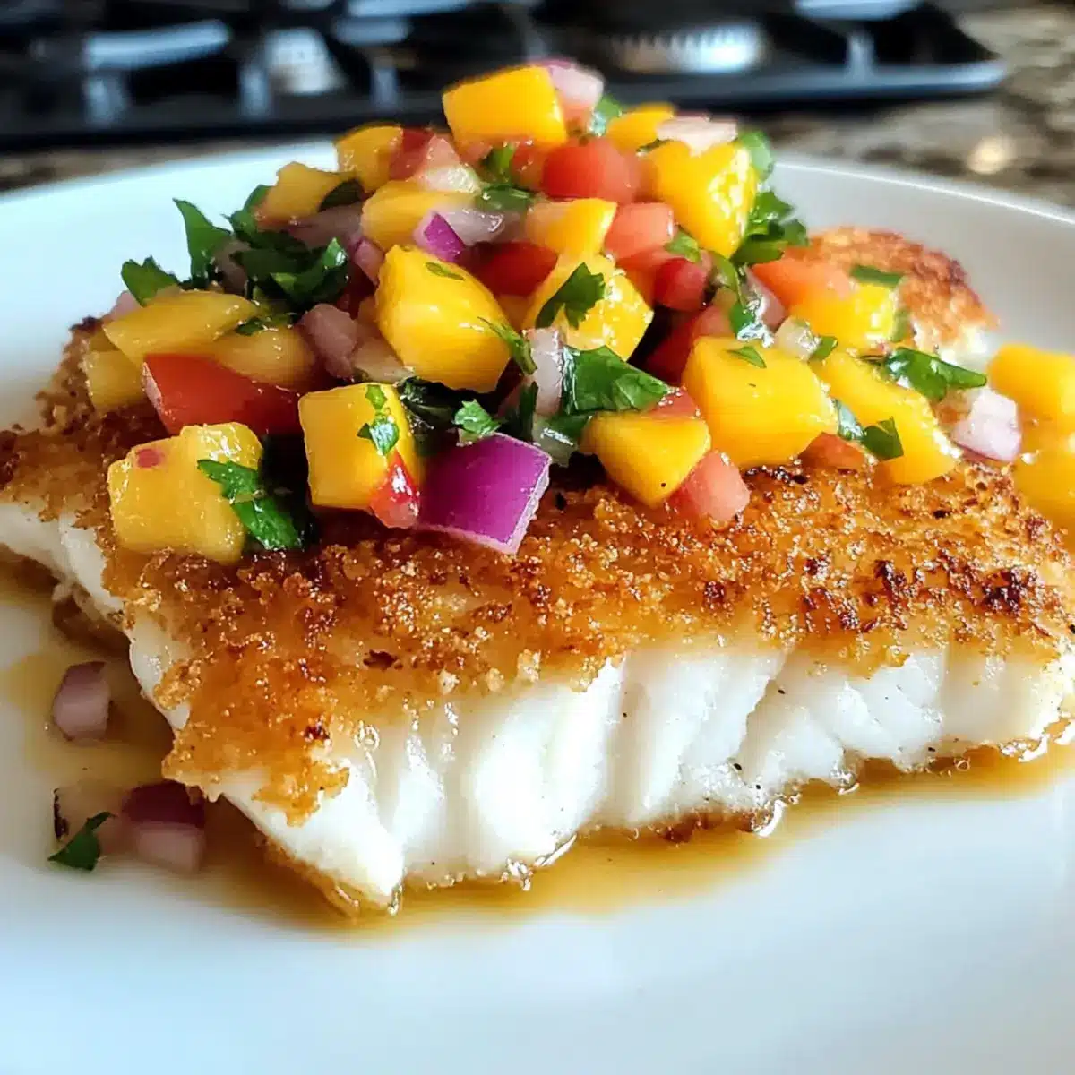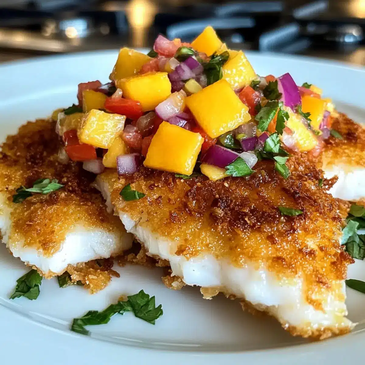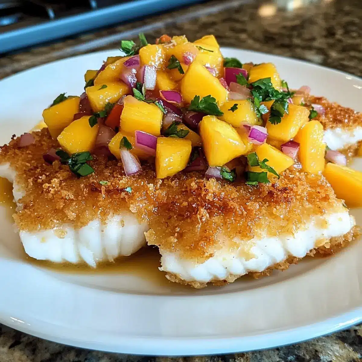 Kokosnusskruste Fisch mit frischer Mangosalsa