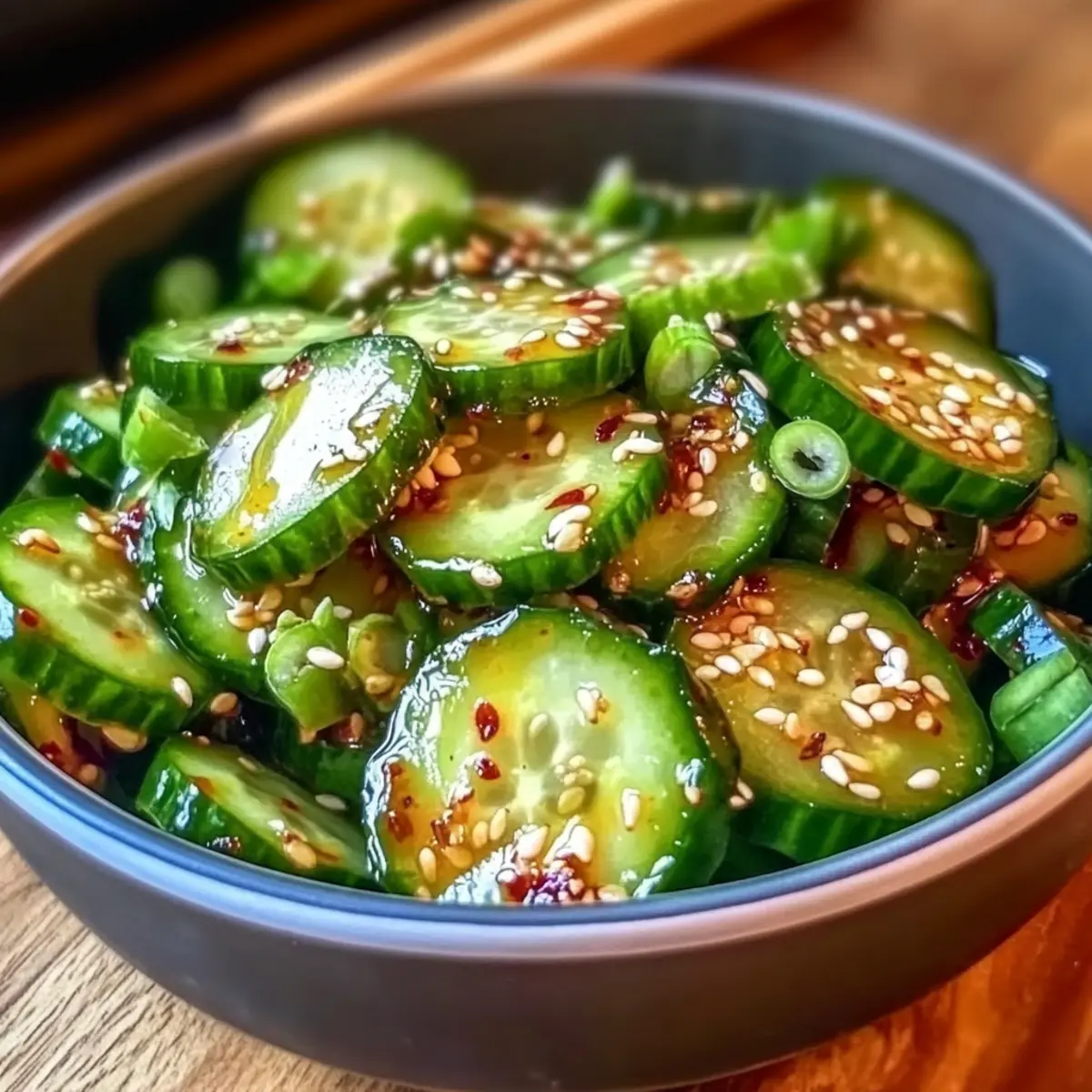 Um den Koreanischen Gurkensalat abzurunden, streuen Sie die gerösteten Sesamkörner und die geschnittenen grünen Zwiebeln darüber. Wenn Sie möchten, können Sie auch etwas gehackten Knoblauch hinzufügen. Diese Garnierungen bieten nicht nur zusätzlichen Geschmack, sondern auch eine attraktive Präsentation.