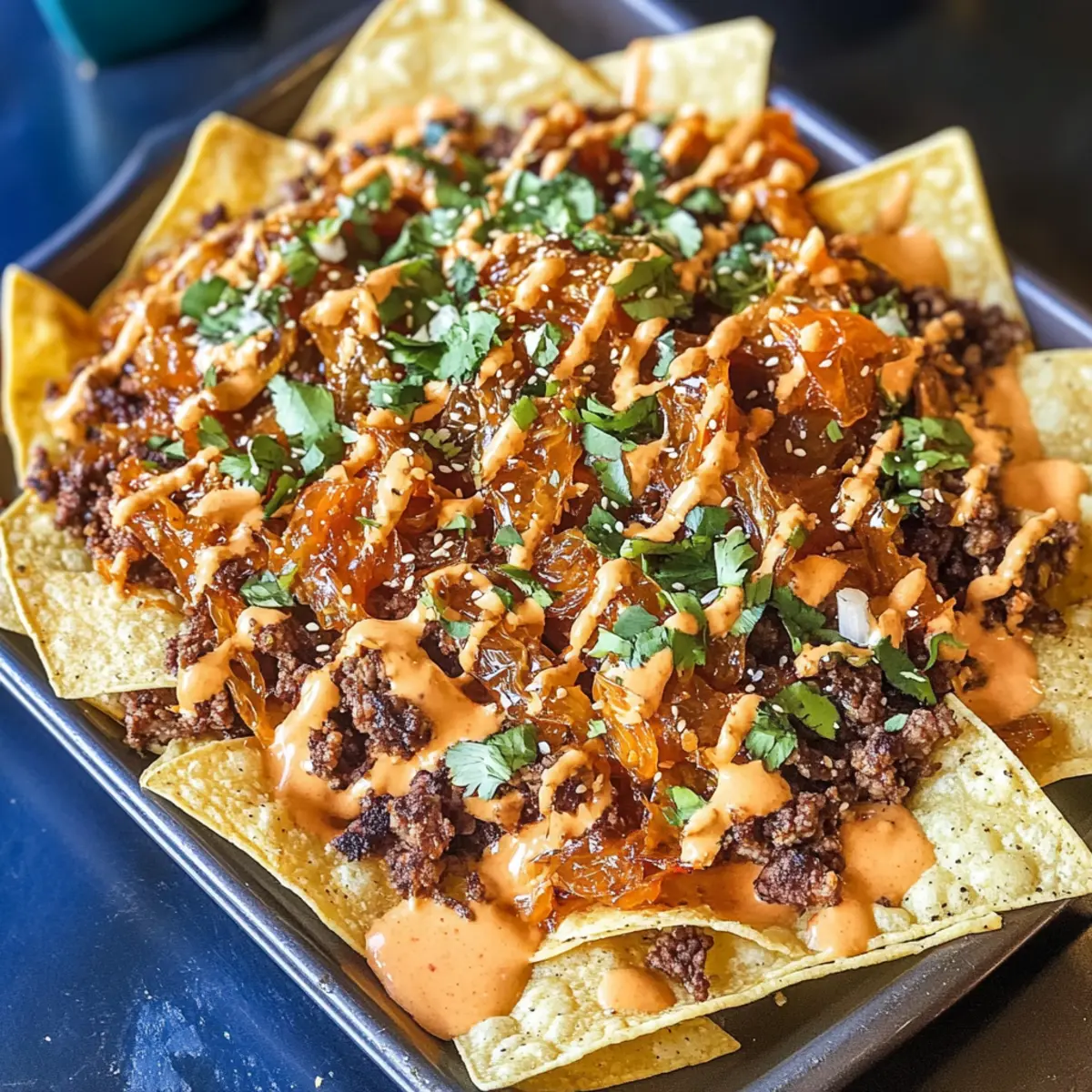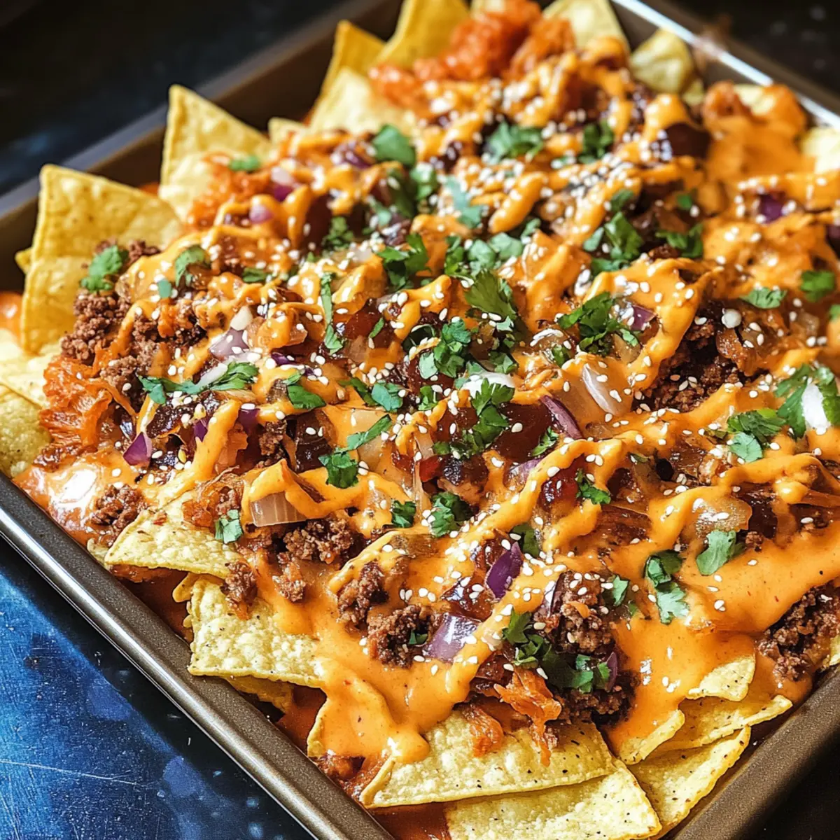 - Serviere die warmen Koreanischen Rindfleisch Nachos sofort.