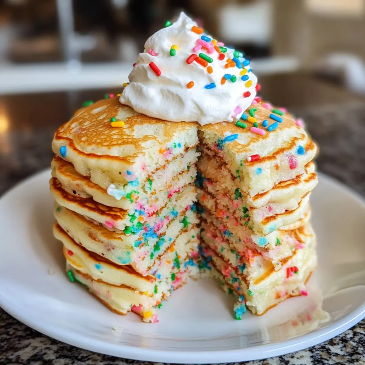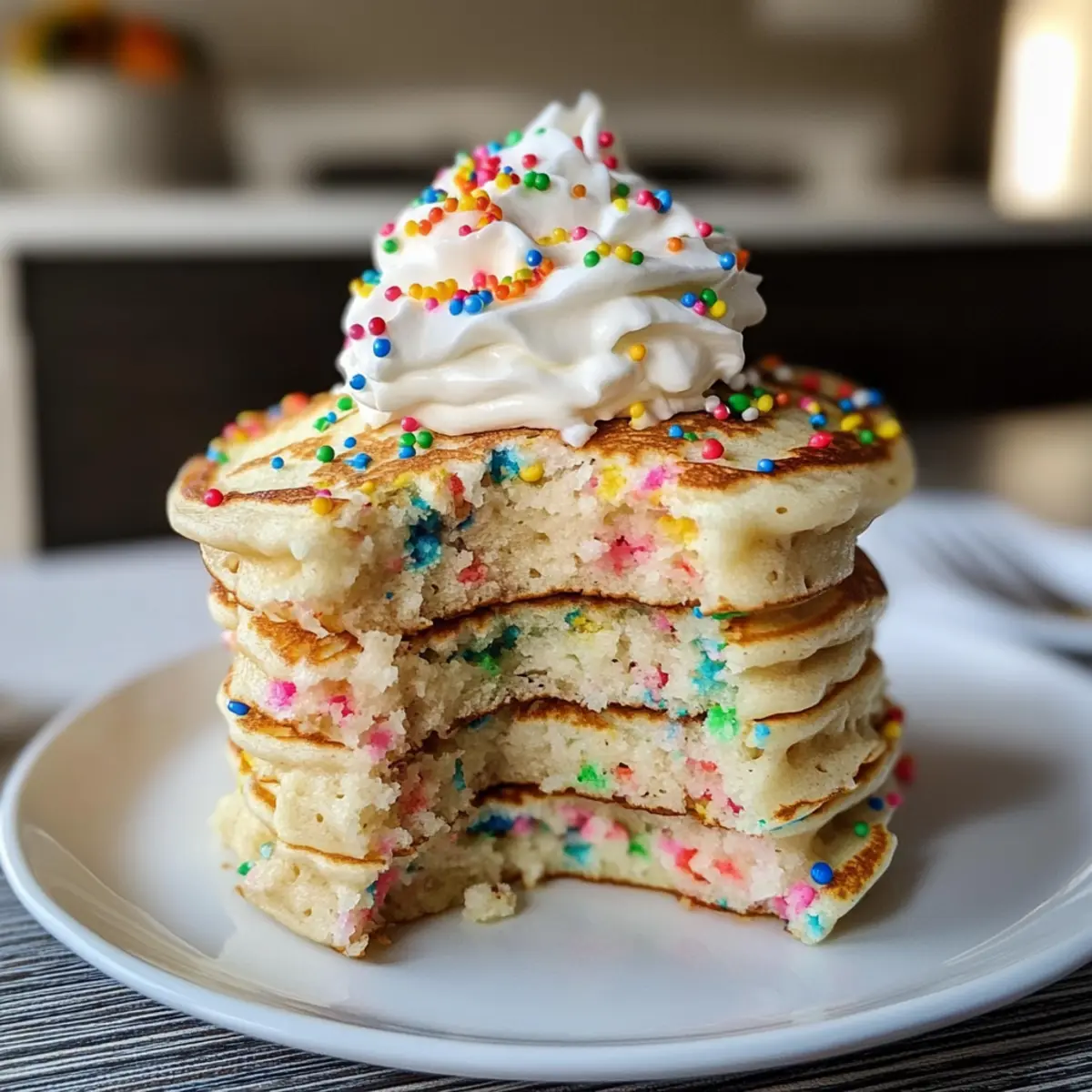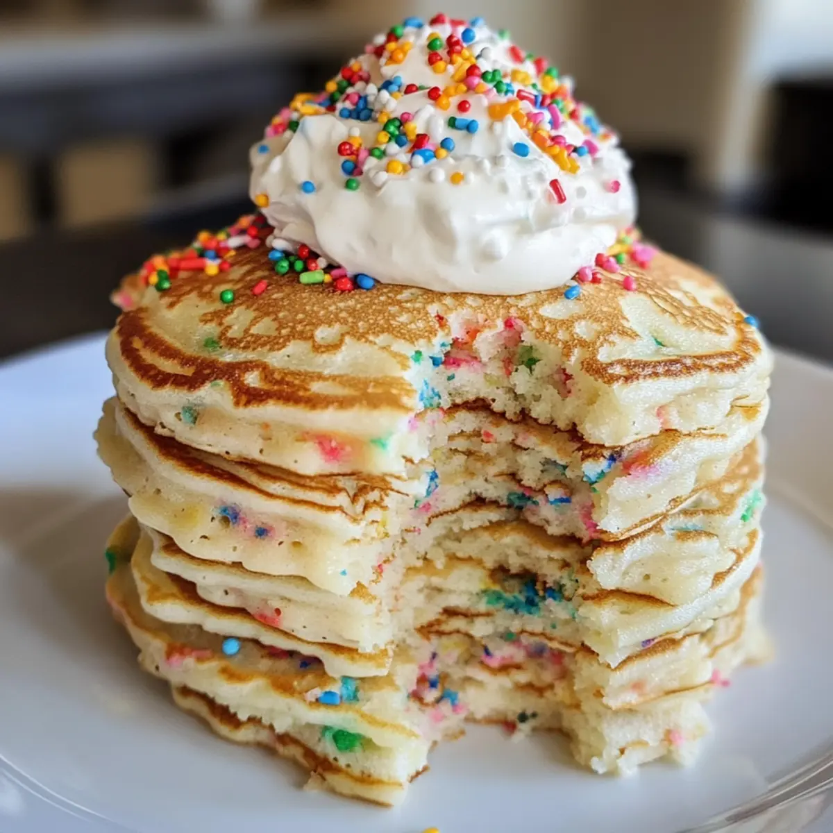 - Serviere die Pfannkuchen sofort auf einem Teller, topped mit der vorbereiteten Sahnehaube und zusätzlich bunten Streuseln.
