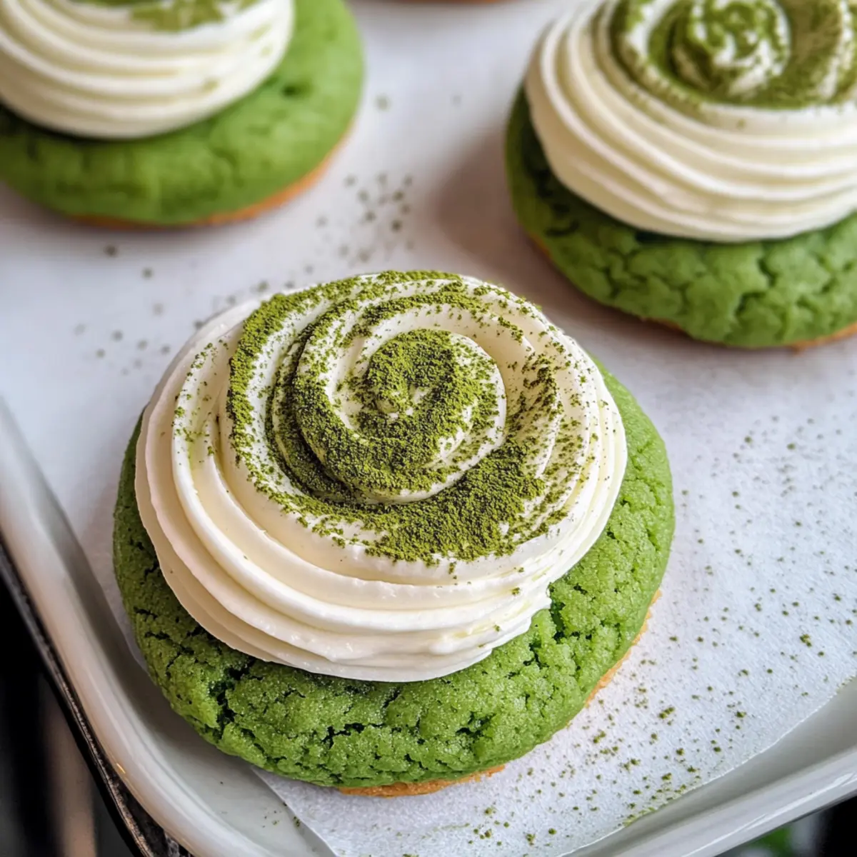 - Creme auftragen und mit Matcha-Pulver bestäuben.