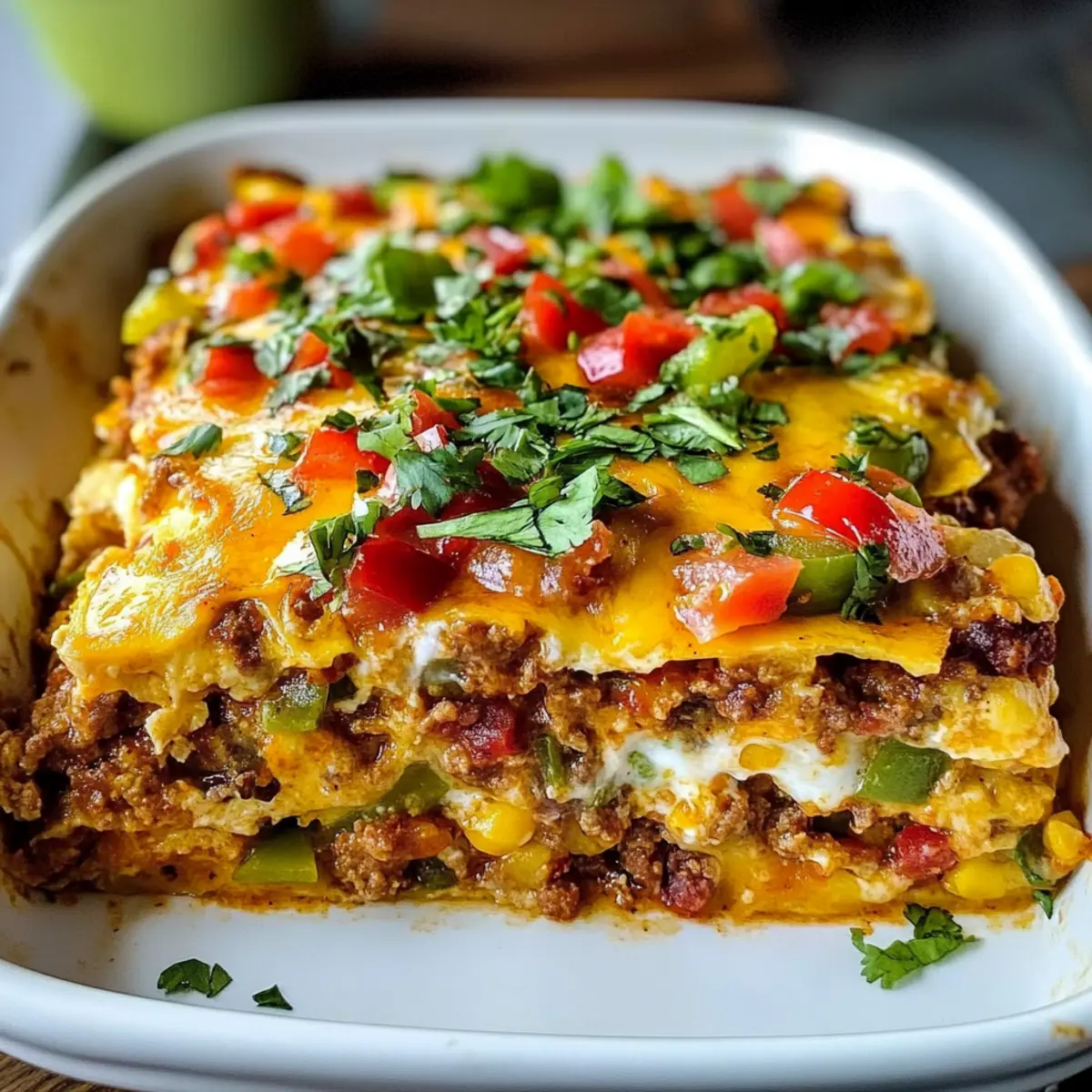 Lass den Auflauf nach dem Backen für etwa 10 Minuten ruhen, damit er sich setzen kann und sich leichter schneiden lässt. Garnieren kannst du ihn nach Belieben mit frischem Koriander, Avocado oder einer Portion Salsa, bevor du ihn servierst.
