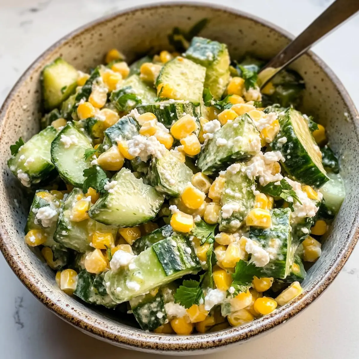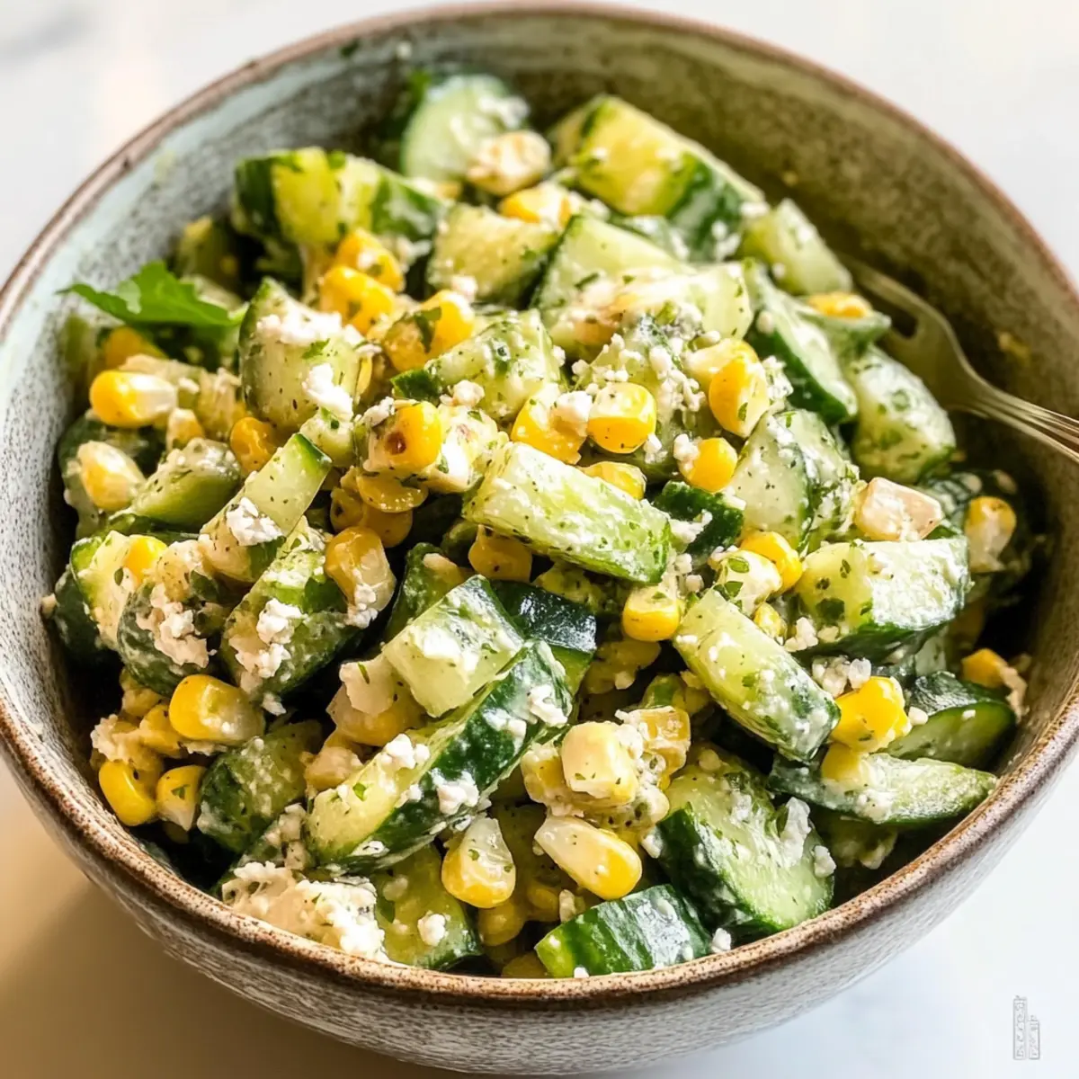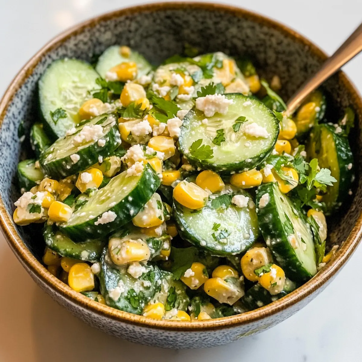 - Zutaten kombinieren: Gurken, aufgetauten Mais, Koriander und Zwiebel ins Dressing geben und gut vermischen.