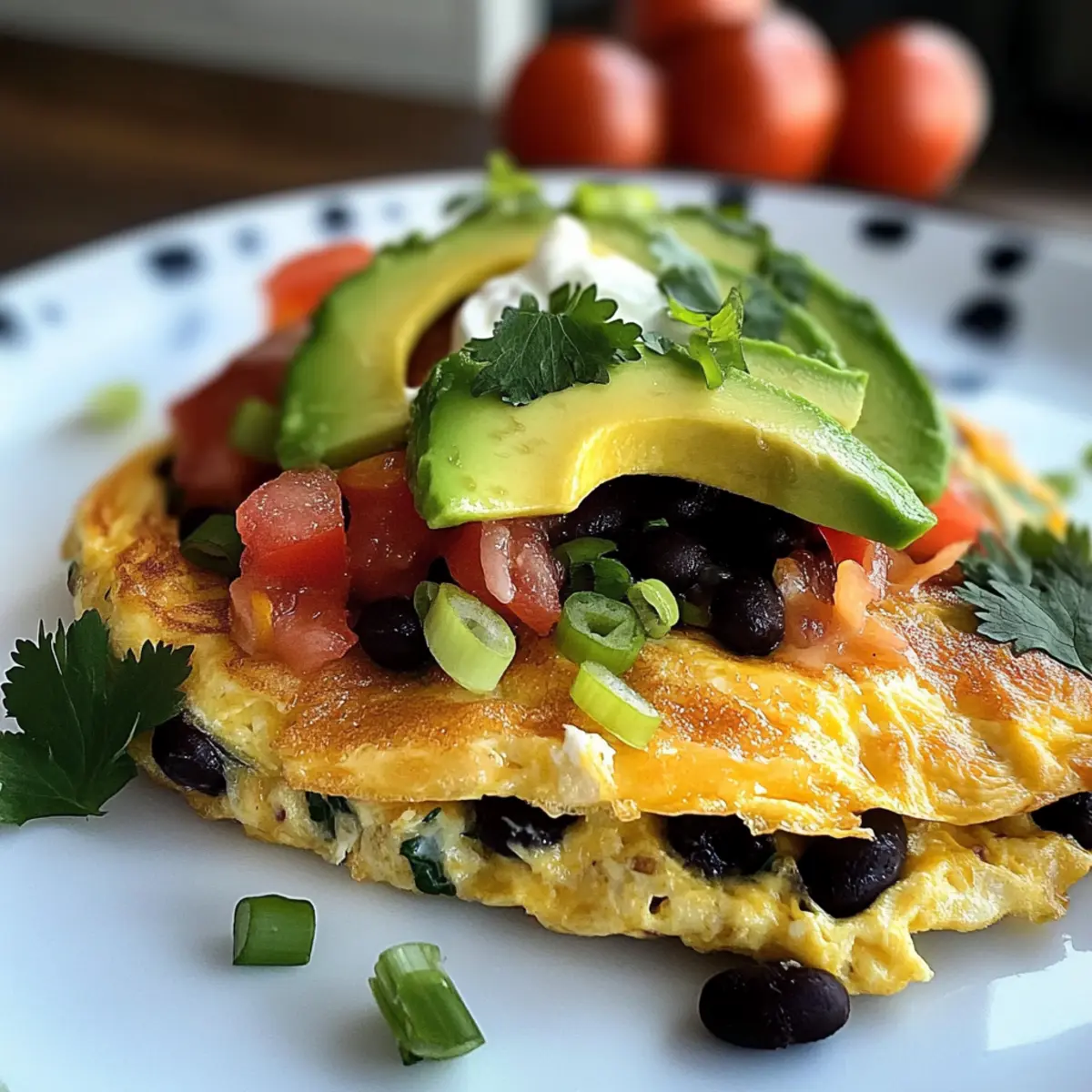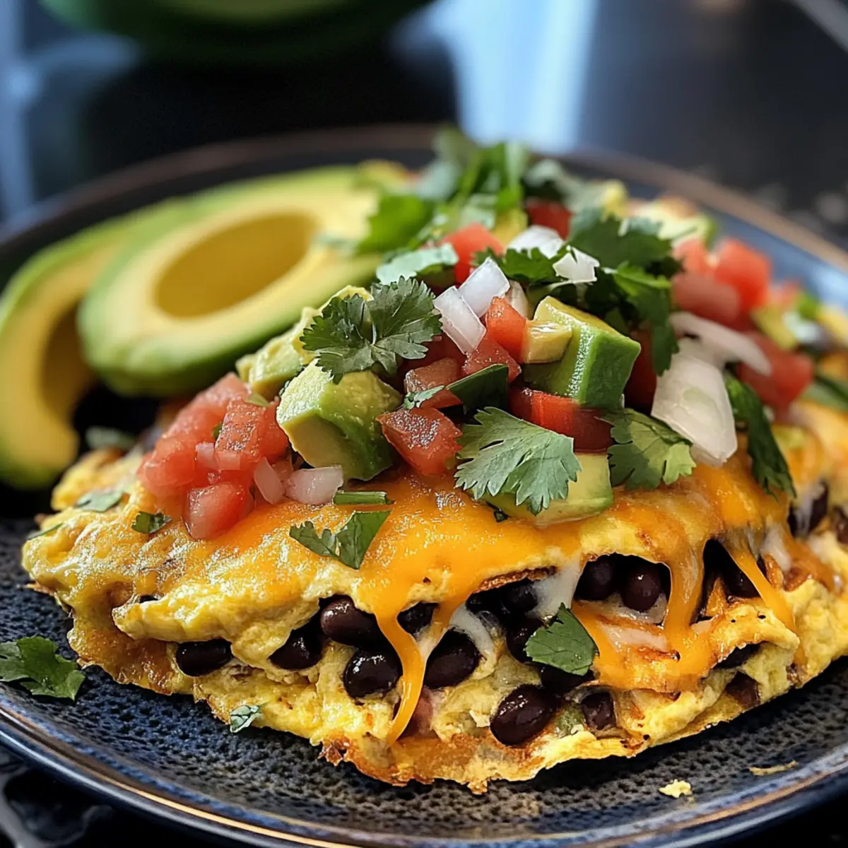 Köstlicher Geschmack: Die Kombination aus schwarzen Bohnen, frischen Eiern und cremiger Avocado verleiht diesem Omelett eine Fülle an Aromen, die jeden Bissen zu einem Genuss machen.
