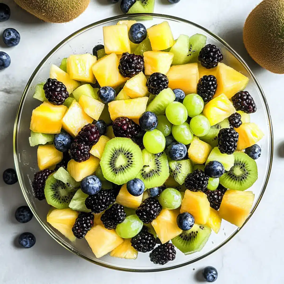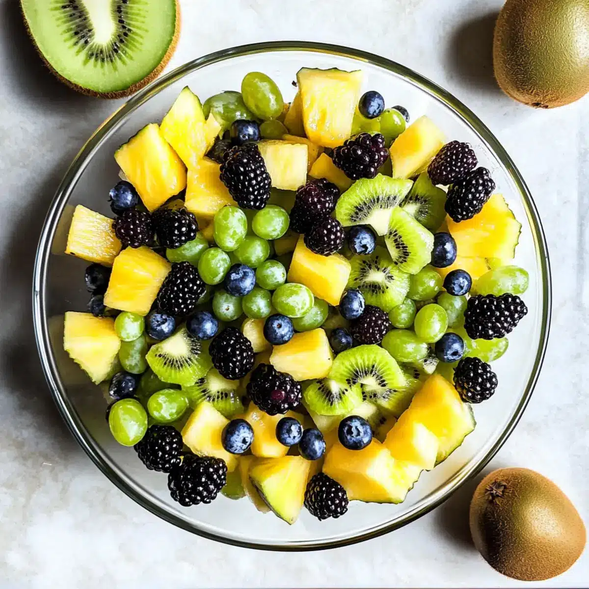 - Nimm eine große Schüssel und füge 1 Tasse gehackte Ananas, 2 in Scheiben geschnittene Kiwis, 1 Tasse gehackte Honigmelone und 1 Tasse grüne Trauben hinzu.