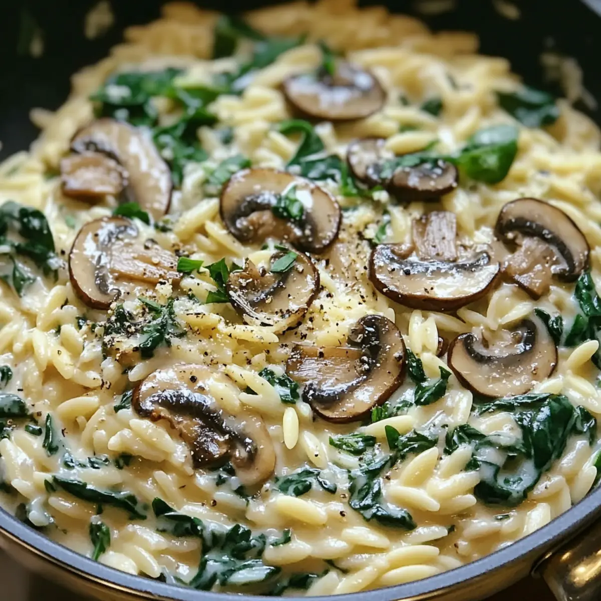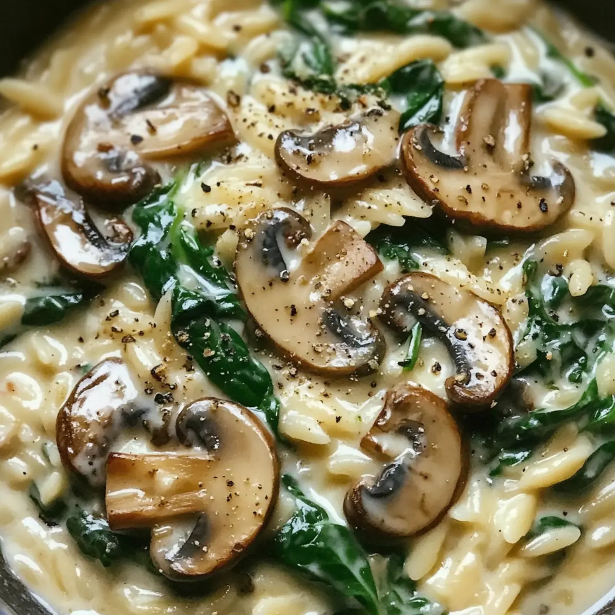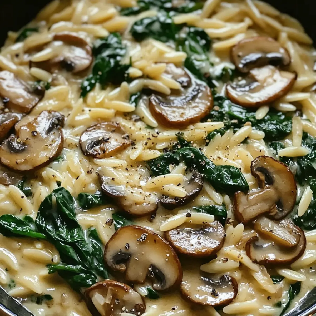 Wunderbare Texturen: Die cremige Sauce umhüllt den al dente Orzo und vereint sich wunderbar mit den zarten Pilzen und dem frischen Spinat.