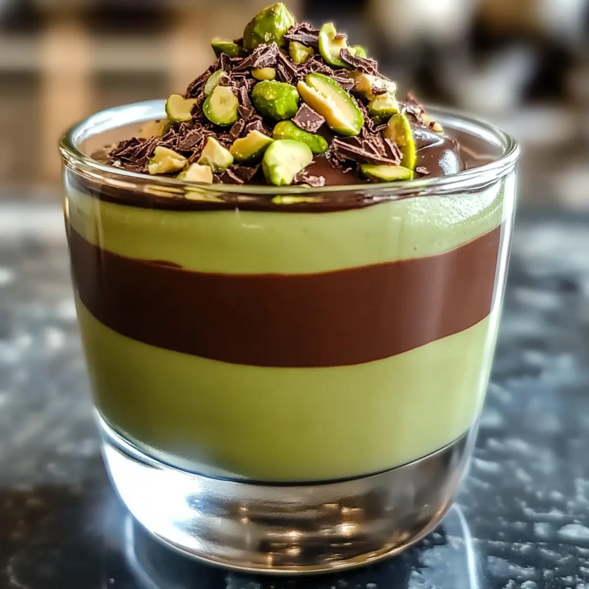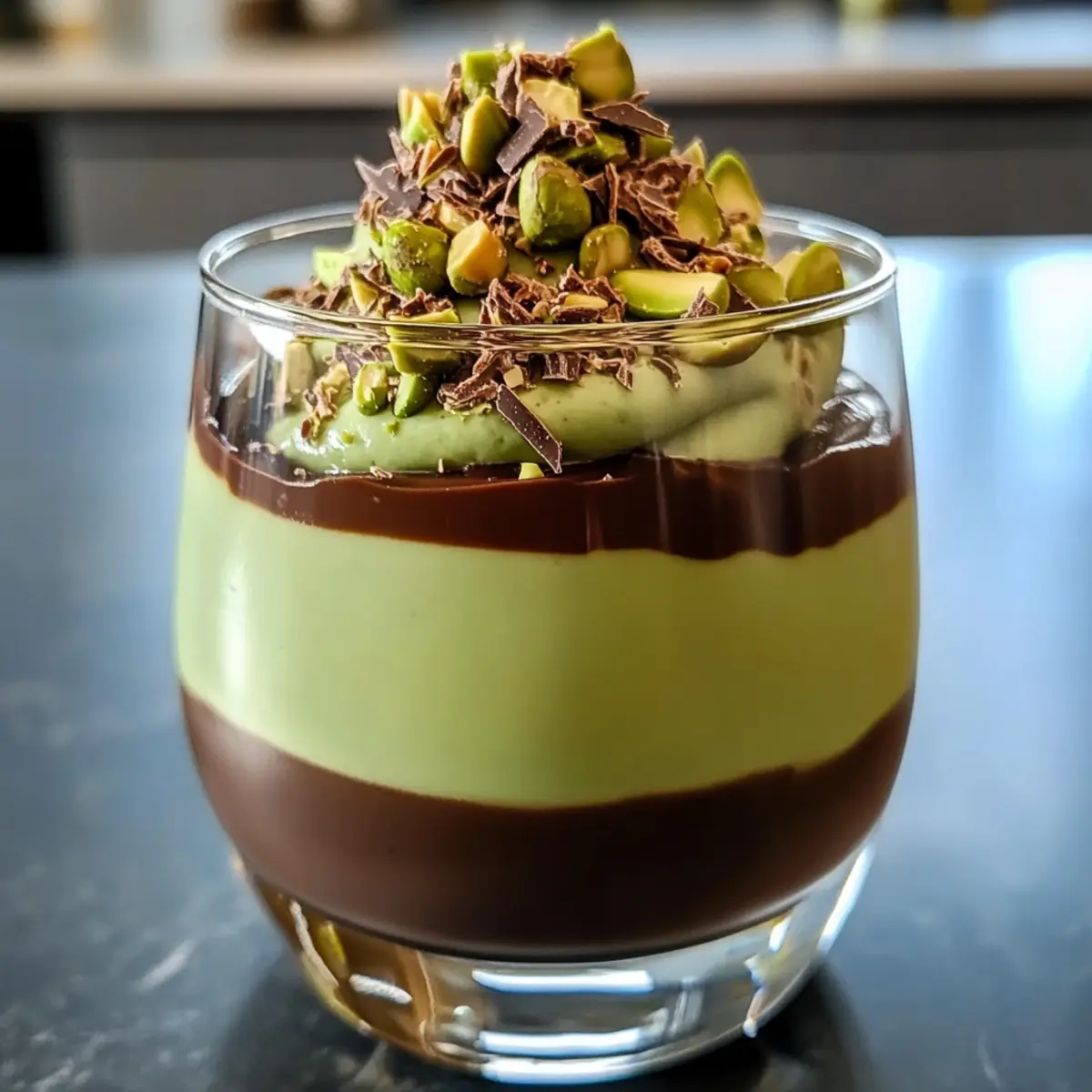 Elegante Genuss: Diese Pistazienmousse überzeugt durch ihre luxuriöse Anmutung und das beeindruckende Schokoladentopping, das jeden süßen Zahn begeistert.