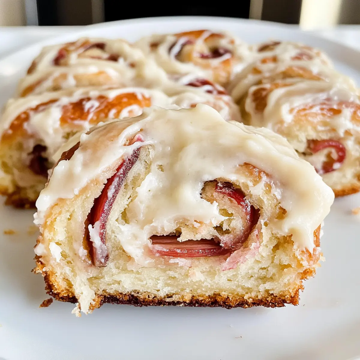 Einzigartiger Geschmack: Diese Brötchen kombinieren die natürliche Säure des Rhabarbers mit der cremigen Süße des Vanille-Bohnen-Mascarpone-Frostings. Jeder Biss ist ein Geschmackserlebnis!