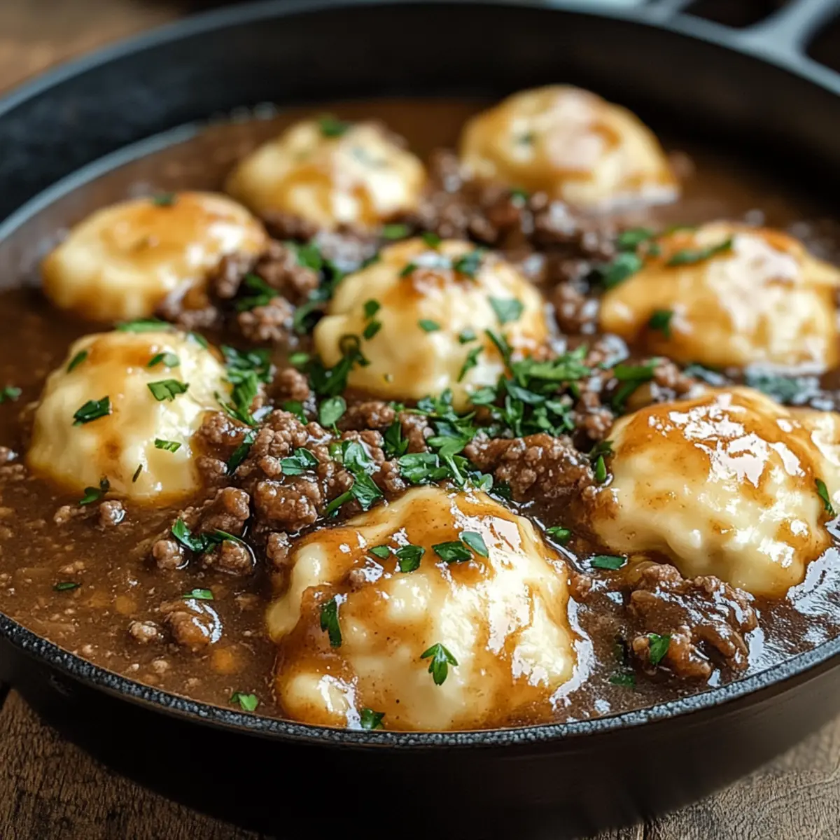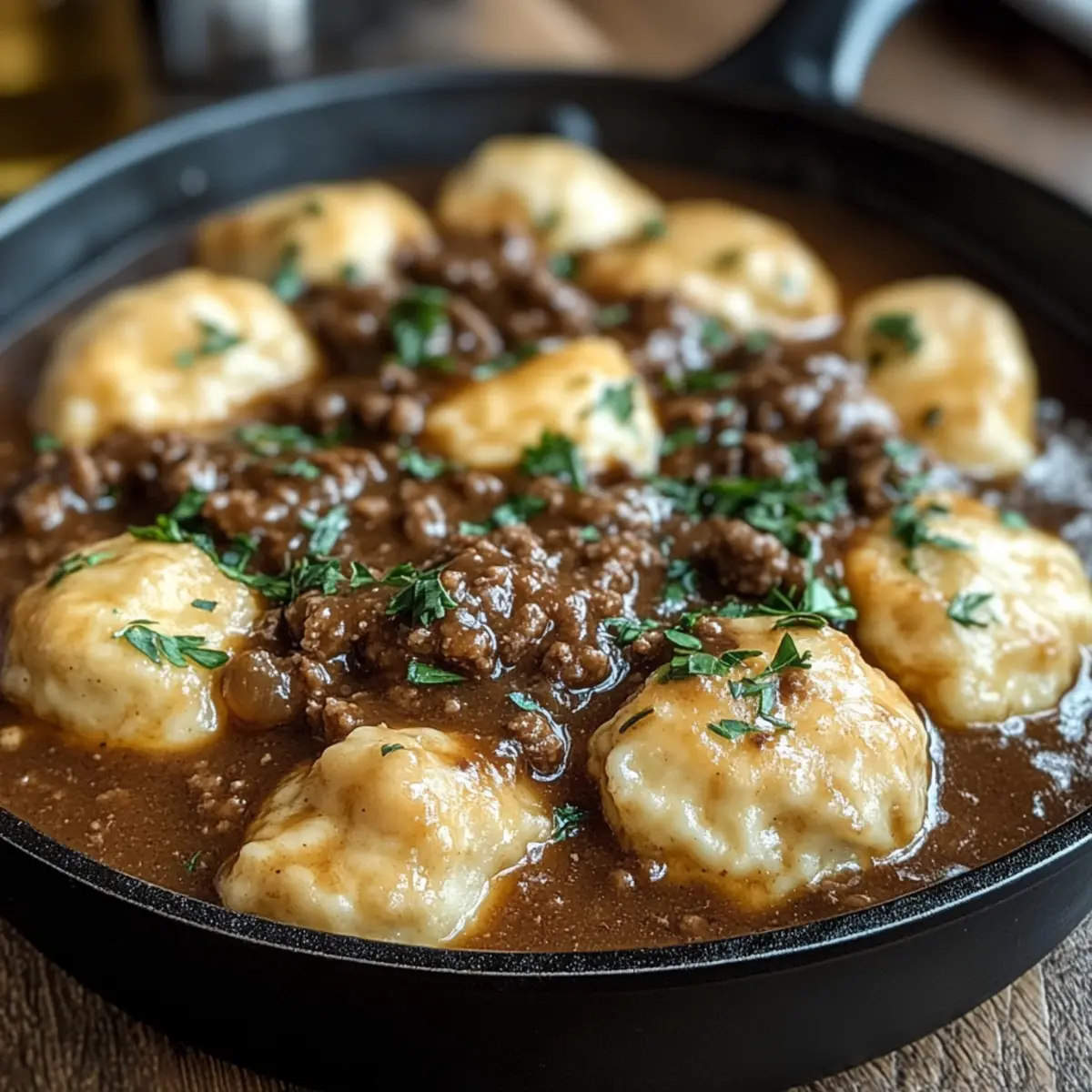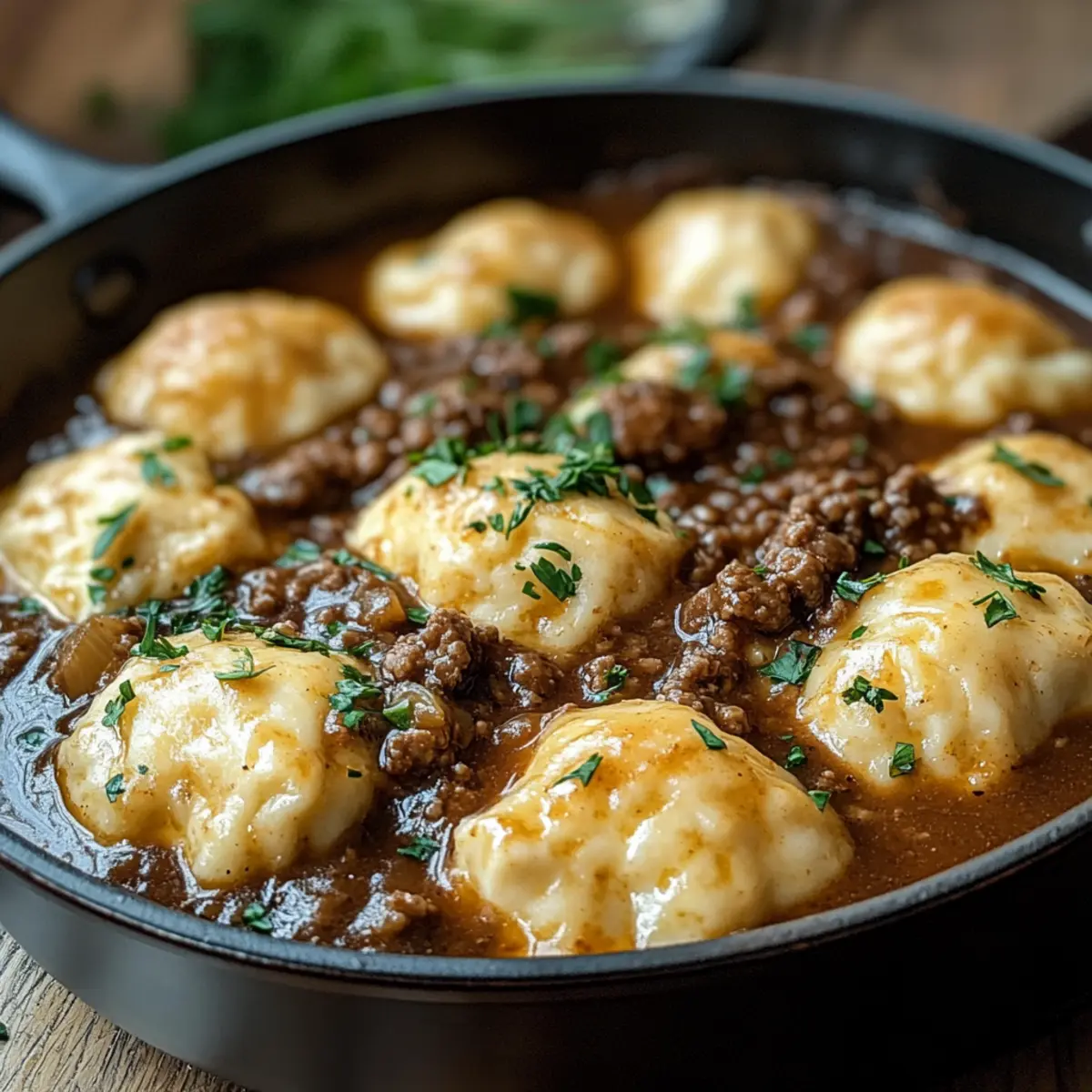 Nimm mit einem Esslöffel Portionen des Dumpling-Teigs und setze sie gleichmäßig auf die köchelnde Rinderhackfleischmischung. Decke die Pfanne mit einem Deckel ab und reduziere die Hitze auf niedrig. Lasse die Dumplings 15-20 Minuten dampfen, ohne den Deckel abzunehmen, um sicherzustellen, dass sie fluffig garen.