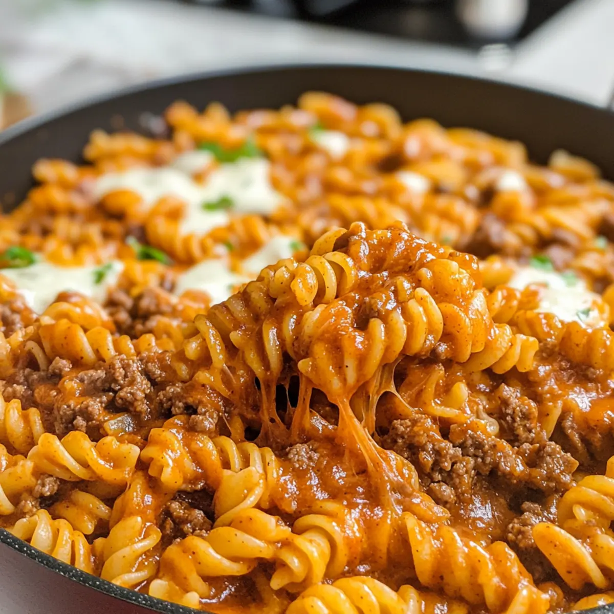 Schnell zubereitet: Mit einer Kochzeit von weniger als 30 Minuten ist es ideal für geschäftige Abende. Die Rindfleisch-Enchilada-Pasta wird schnell zu deinem neuen Lieblingsgericht!