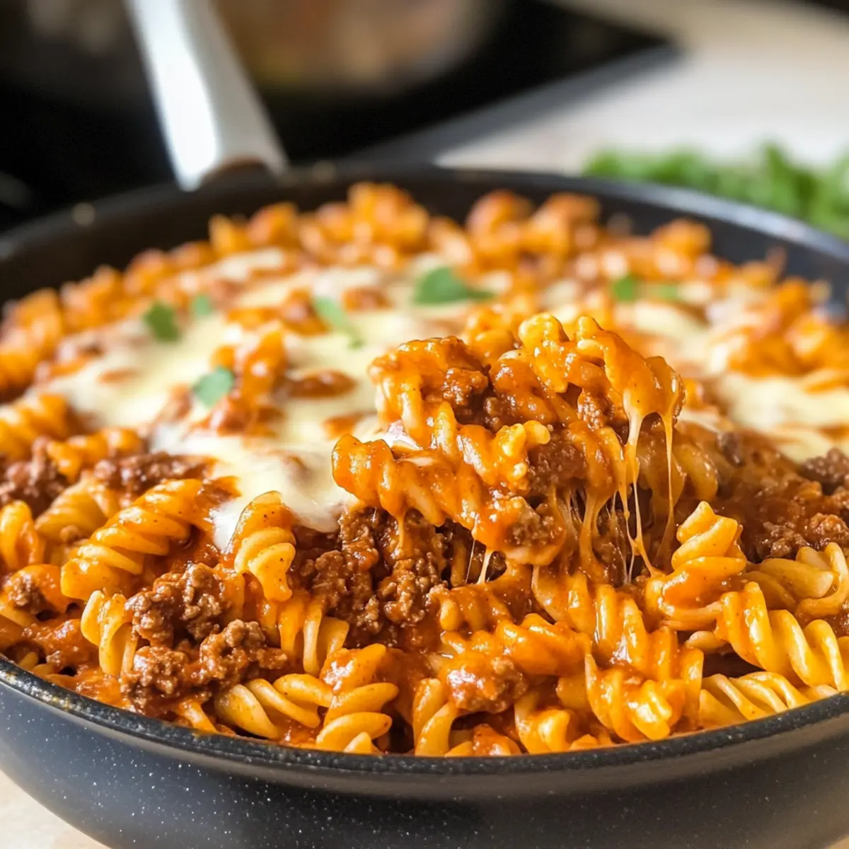 - Köcheln lassen: Reduziere die Hitze auf mittel-niedrig und decke die Pfanne mit einem Deckel ab. Lasse die Rindfleisch-Enchilada-Pasta 10-15 Minuten simmern.