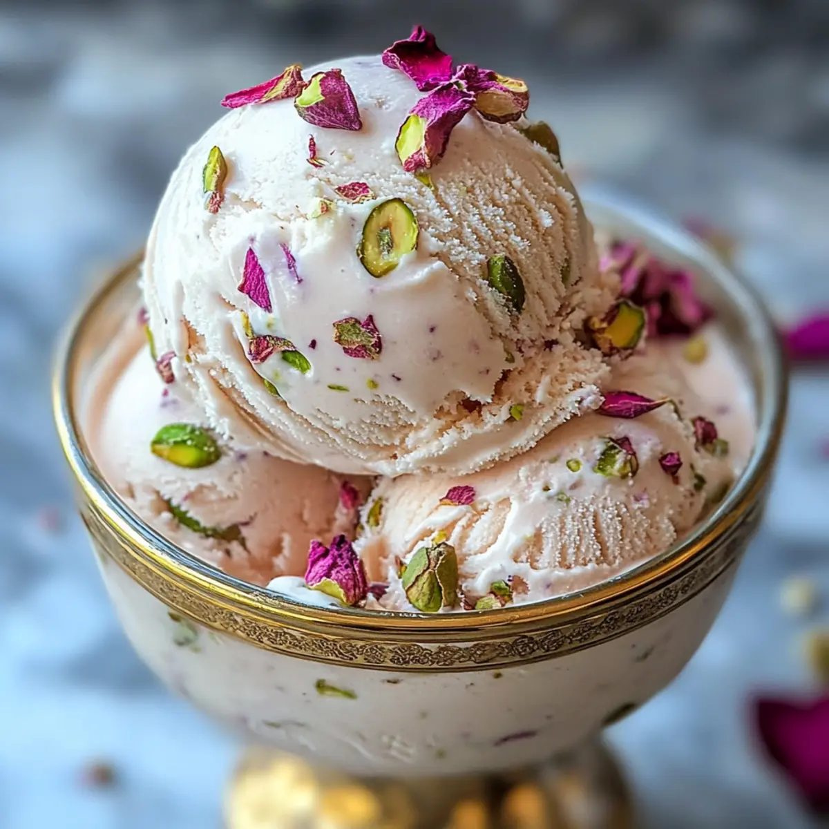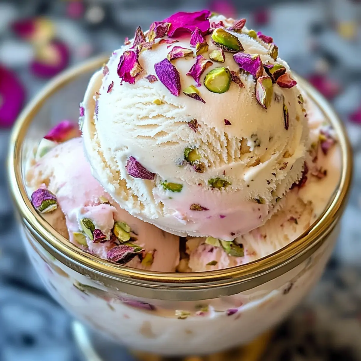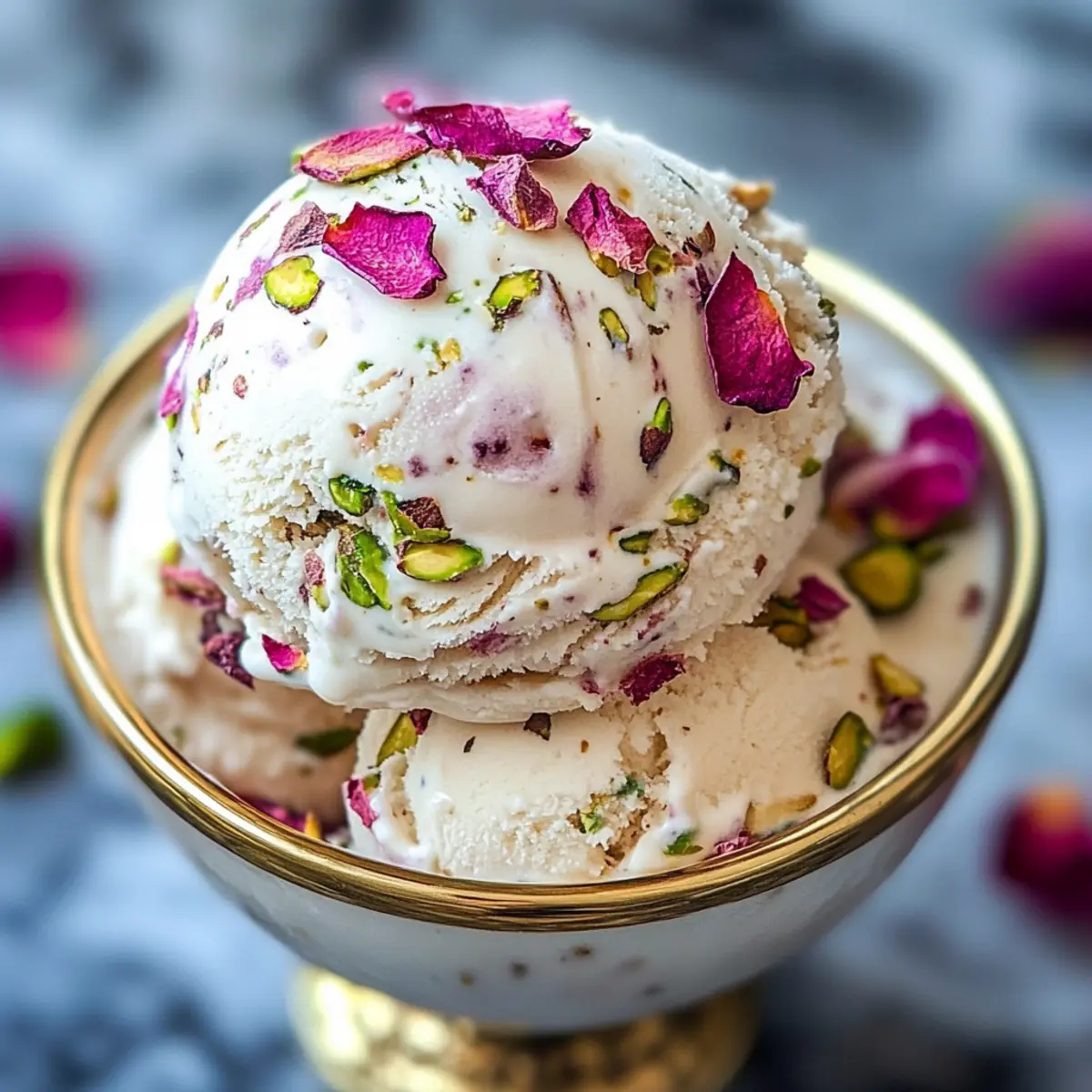 Vor dem Servieren lasse die Eiscreme 5 Minuten bei Raumtemperatur stehen, damit sie leichter zu portionieren ist. Verwende einen Eisportionierer, um die Rosenpistazie Cheesecake Eiscreme in elegante Schalen zu geben. Dieses cremige Dessert erfreut sowohl im Geschmack als auch in der Optik – ideal für besondere Anlässe!