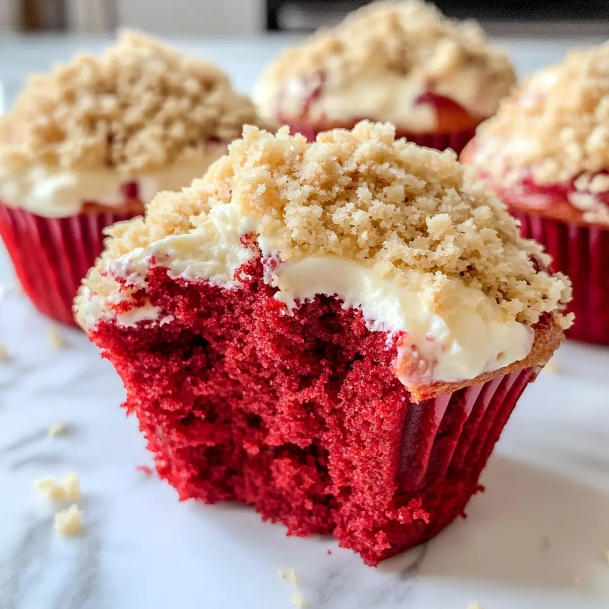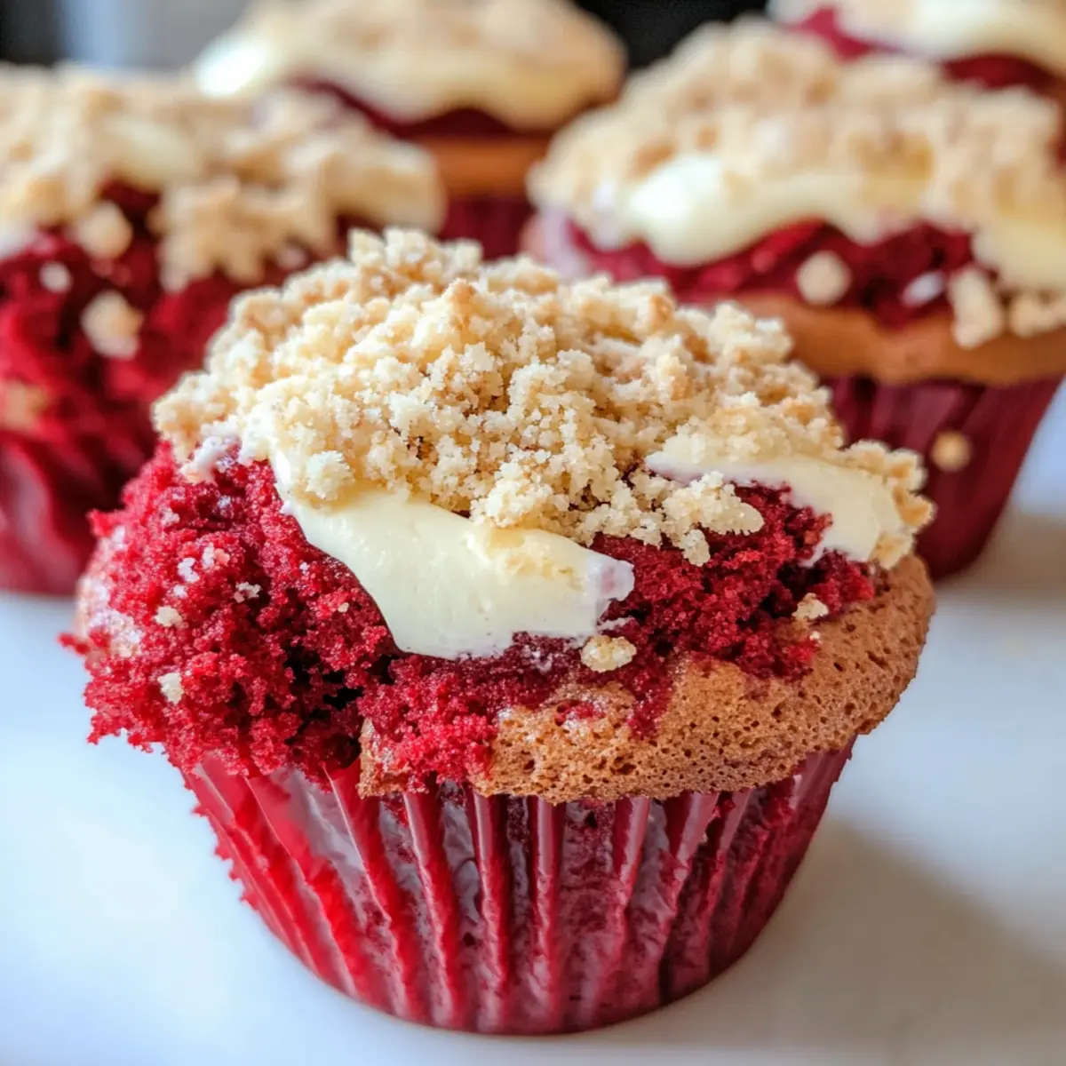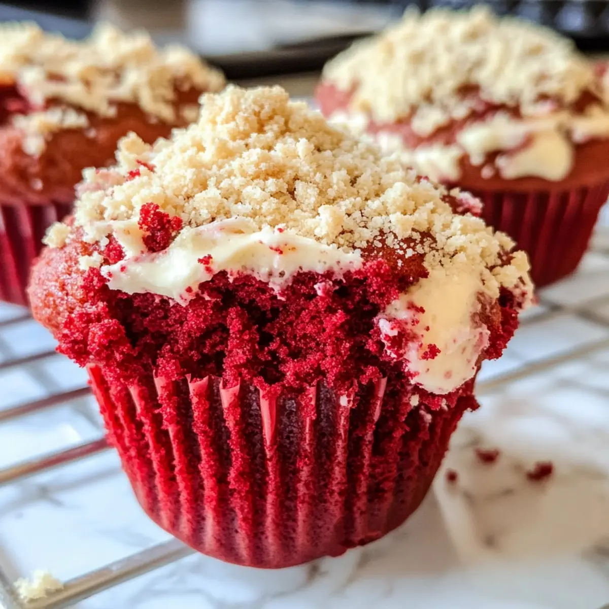 Diese Rot Samt Muffins mit Frischkäse sind perfekt für Meal Prep! Du kannst die trockenen Zutaten (Mehl, Zucker, Backpulver, Salz, Kakaopulver) bereits bis zu 3 Tage im Voraus mischen und in einem luftdichten Behälter aufbewahren, um Zeit zu sparen. Auch das Streusel-Topping kann im Voraus zubereitet und bis zu 2 Tage kühl gelagert werden. Wenn du bereit bist zu backen, vermische die nassen Zutaten (Eier, Öl, Buttermilch, Lebensmittelfarbe) und füge sie den vorbereiteten trockenen Zutaten hinzu, gefolgt von der Frischkäsefüllung, um die köstlichen Marmoreffekte zu erhalten. So bleiben die Muffins frisch, fluffig und einfach unwiderstehlich – perfekt für beschäftigte Wochentage!