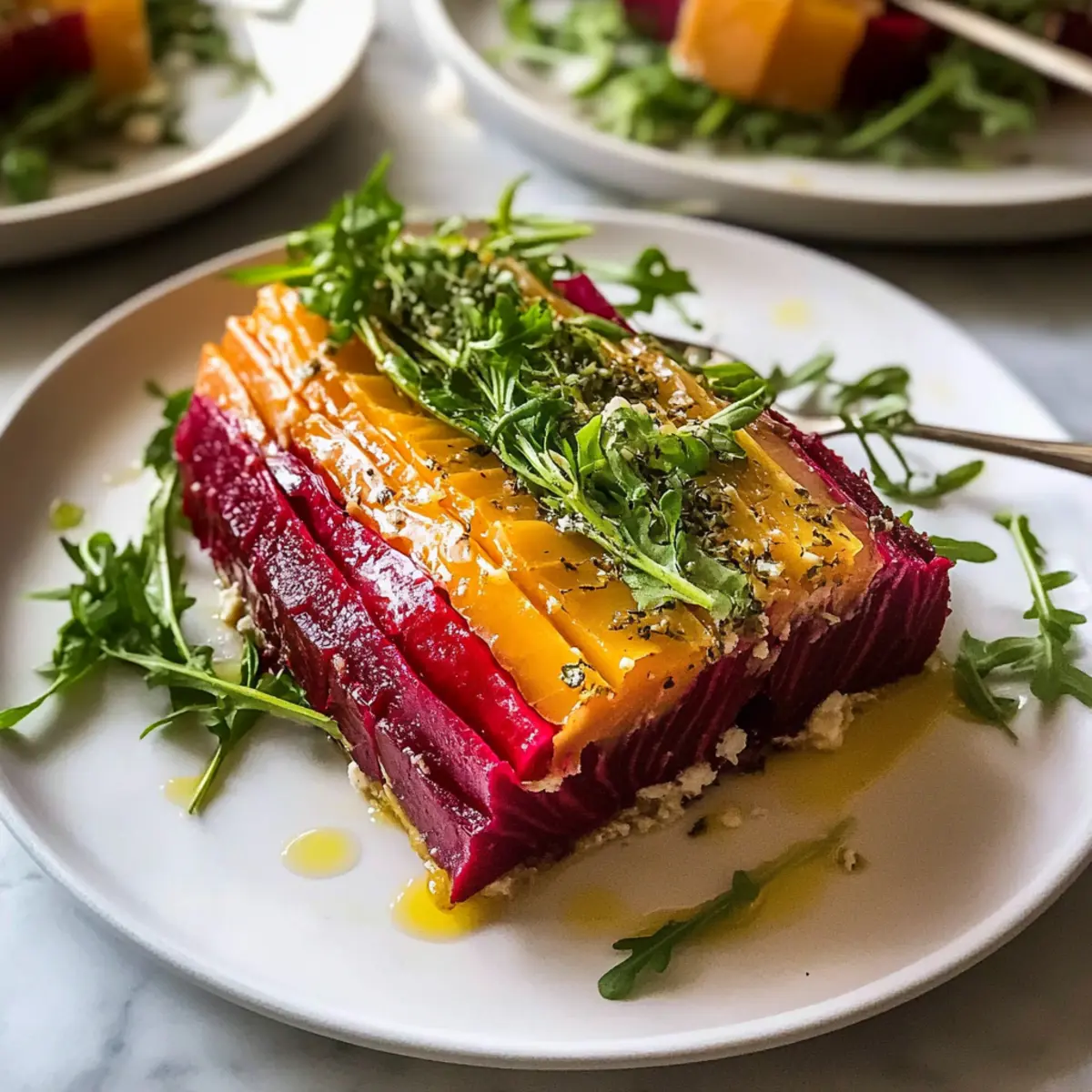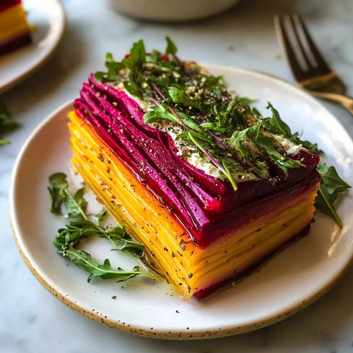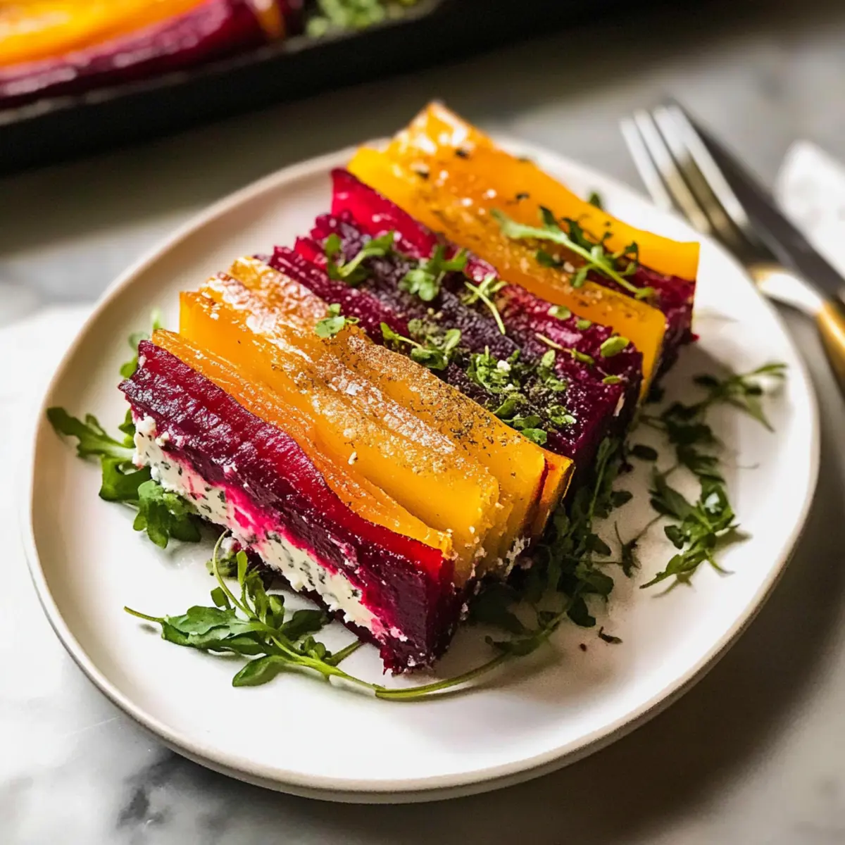 Legen Sie eine Kastenform mit Frischhaltefolie aus. Beginnen Sie mit einer Schicht der geschnittenen roten Rüben, gefolgt von einer Schicht der Käsemischung. Wiederholen Sie diesen Vorgang, bis die Form gefüllt ist, wobei Sie abschließend eine Schicht goldene Rüben oben auflegen, um ein ansprechendes Aussehen zu gewährleisten.
