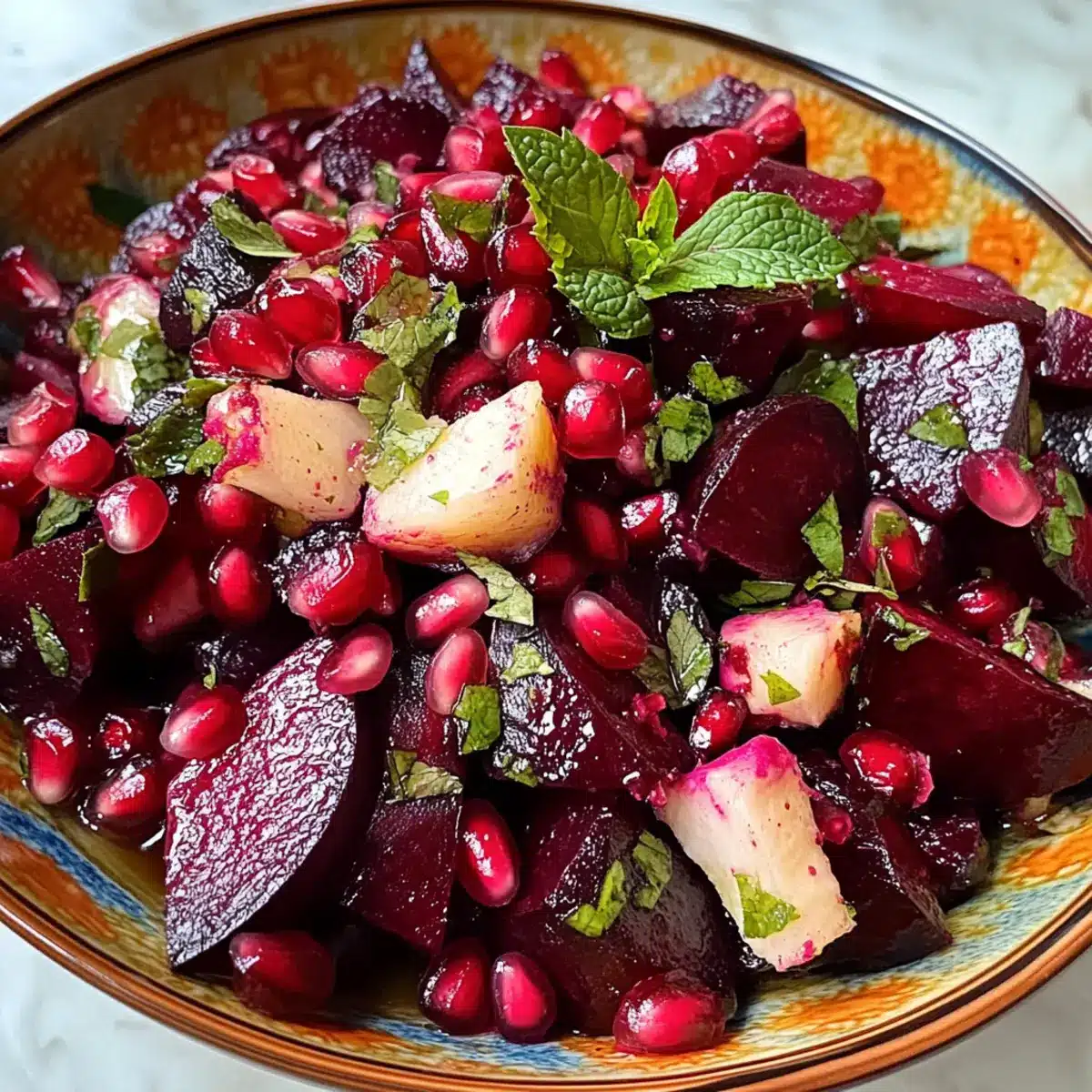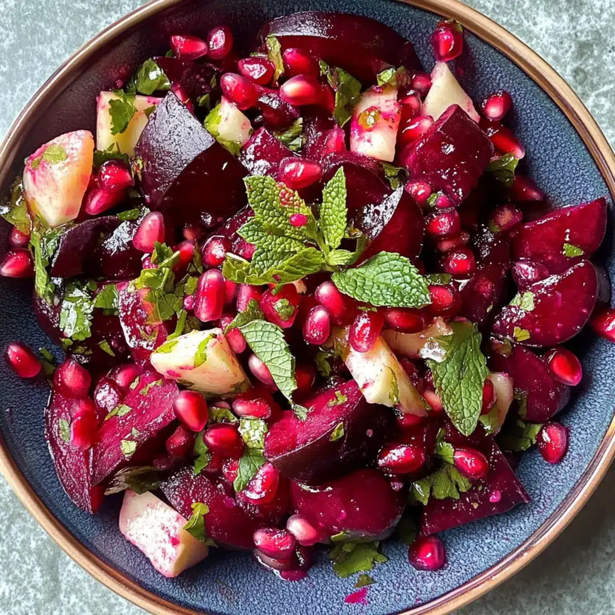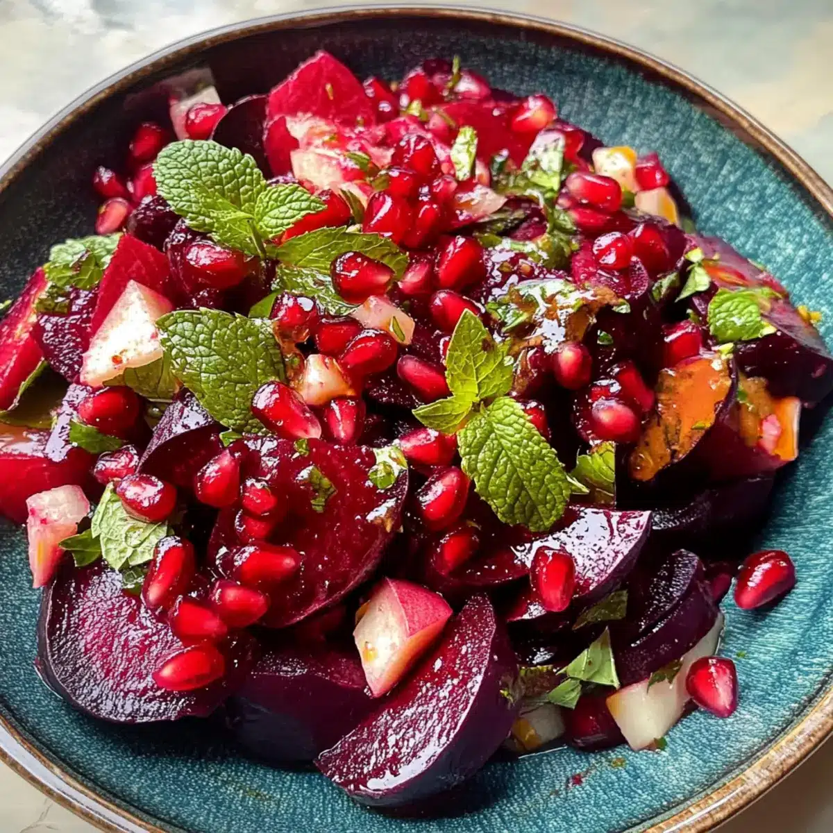 Einzigartig und gesund: Dieser Rübe und Granatapfel-Salat zeigt, dass gesundes Essen nicht langweilig sein muss. Vielfalt der Aromen: Die Kombination aus erdigen Rüben und süßen Granatapfelkernen schafft ein Geschmacksfeuerwerk, das Ihre Geschmacksknospen begeistert. Einfache Zubereitung: Mit nur wenigen frischen Zutaten und unkomplizierten Schritten ist dieser Salat schnell zubereitet. Nährstoffreich: Reich an Antioxidantien und Vitaminen, unterstützt er Ihre Gesundheit und Ernährung. Perfekt für jede Gelegenheit: Ob als leichtes Mittagessen oder als schmackhafte Beilage – dieser Salat macht überall eine gute Figur. Machen Sie sich bereit, Ihre Gäste zu beeindrucken!