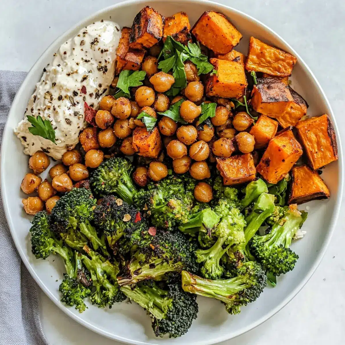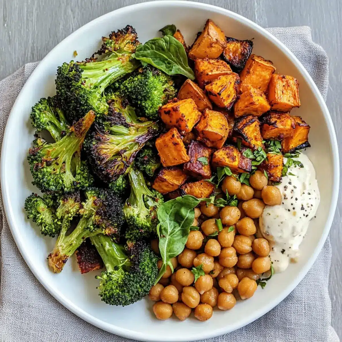Bringe das Blech zurück in den Ofen und röste alles für weitere 10 bis 15 Minuten. Die Brokkoli sollte knackig und knallgrün sein, während die Süßkartoffeln und Kichererbsen zart und karamellisiert sind. Überwache den Garprozess, um sicherzustellen, dass die Zutaten nicht übergart werden.
