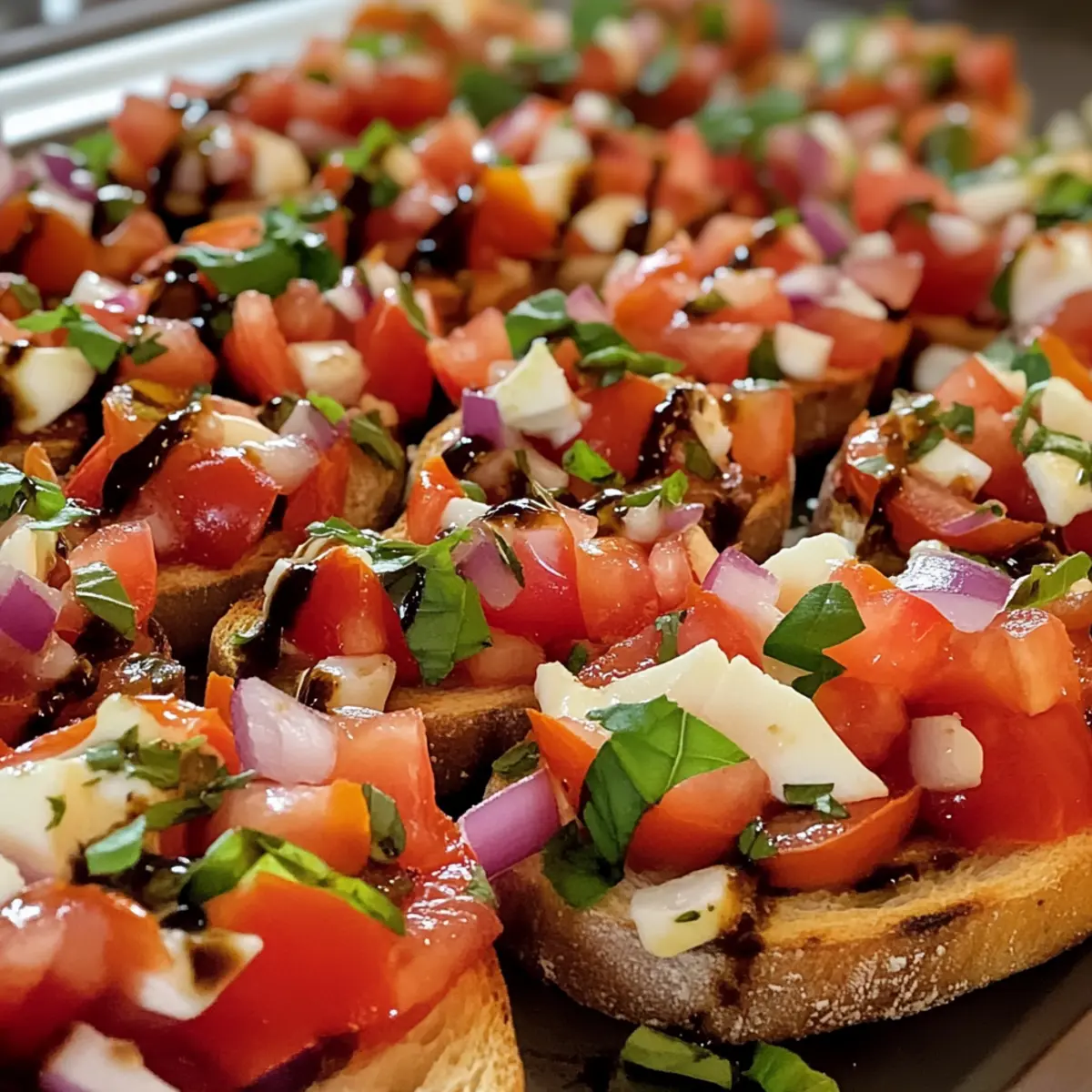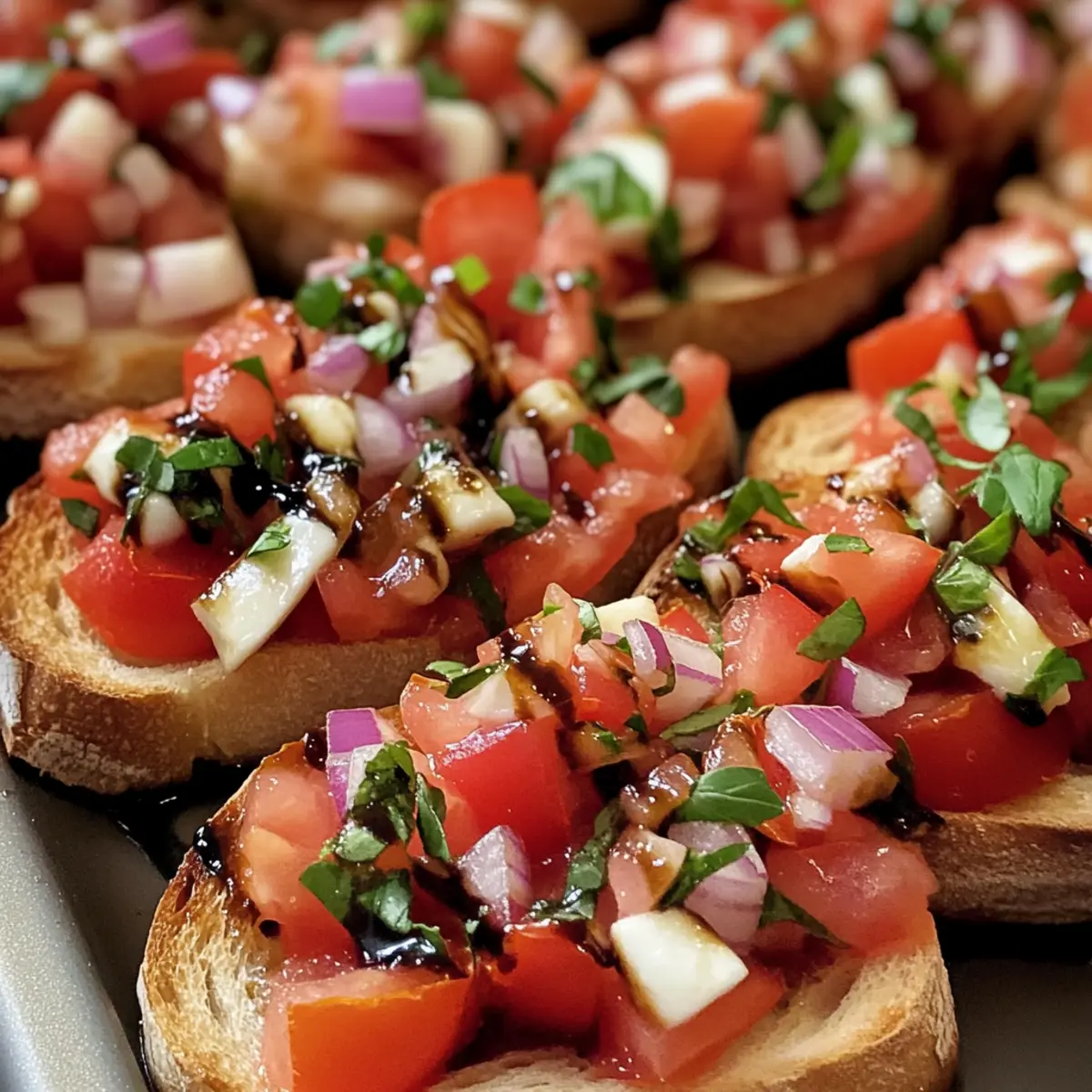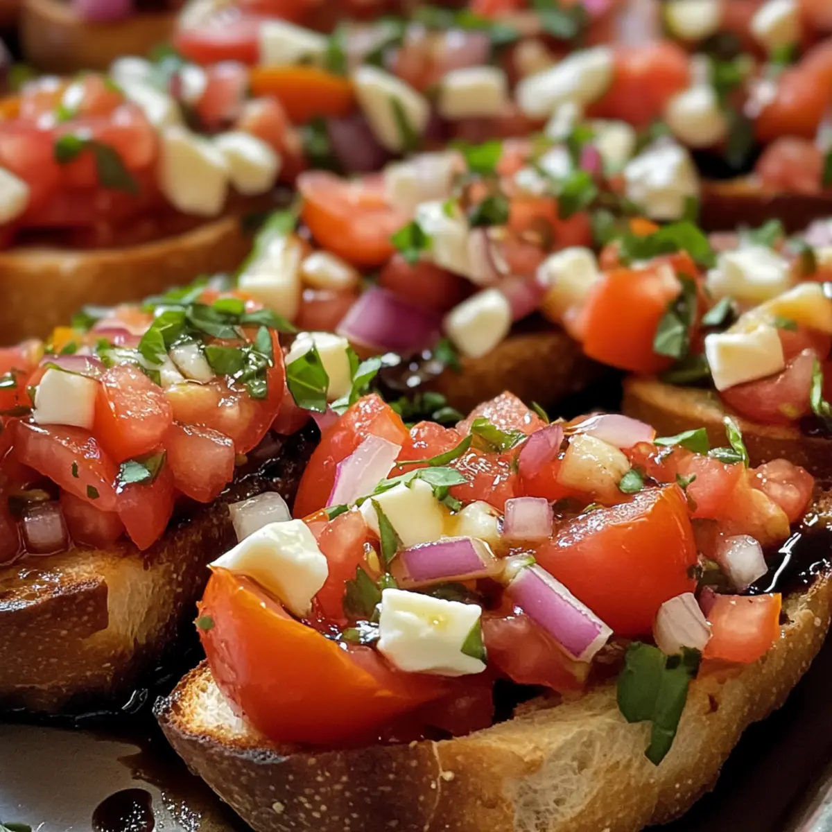 Die Tomaten Bruschetta eignet sich hervorragend für die Vorausplanung! Sie können die Tomatenmischung bis zu 3 Tage im Voraus zubereiten und im Kühlschrank aufbewahren, um die Aromen gut miteinander verschmelzen zu lassen. Achten Sie darauf, das Basilikum erst kurz vor dem Servieren hinzuzufügen, um die frische Farbe zu erhalten. Ebenso kann die Balsamico-Glasur bis zu 24 Stunden im Voraus hergestellt werden; kühlen Sie sie einfach, um die Konsistenz zu bewahren. Wenn es Zeit zum Servieren ist, rösten Sie die vorbereiteten Baguette-Scheiben frisch, damit sie schön knusprig sind. Dies spart Ihnen wertvolle Zeit und sorgt gleichzeitig für eine schmackhafte Präsentation, die einfach nicht enttäuscht!