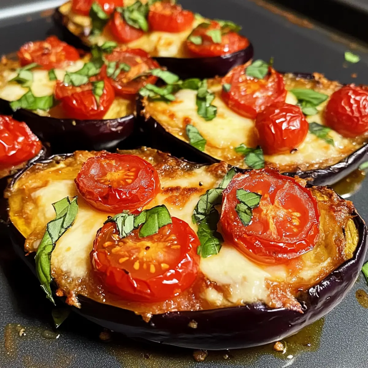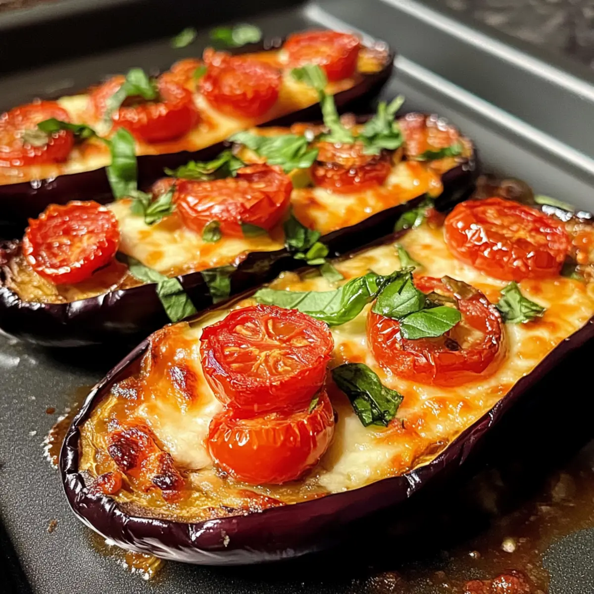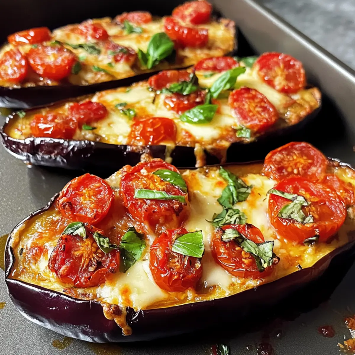 Verteile die Tomatensauce gleichmäßig über die gebackenen Auberginenhälften. Belege sie dann mit halbierten Kirschtomaten und Scheiben des frischen Mozzarellas. Dieses Layering sorgt nicht nur für zusätzlichen Geschmack, sondern macht das Gericht auch optisch ansprechend.