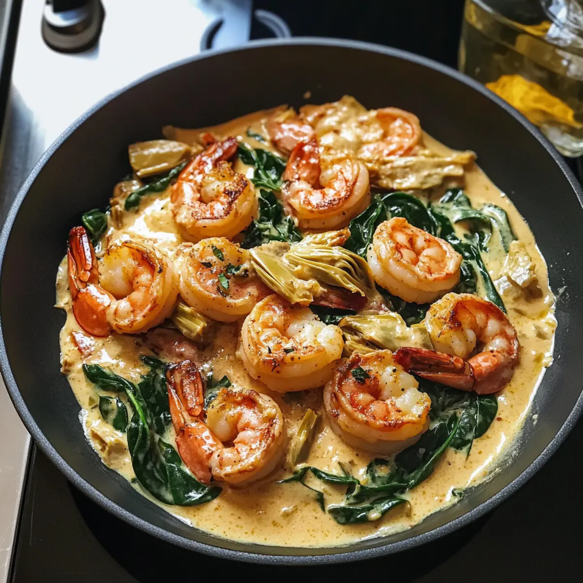 Gib die gebratenen Garnelen zurück in die Pfanne und löffle die cremige Soße darüber. Lasse alles für weitere 2 Minuten bei niedriger Hitze köcheln, damit die Garnelen wieder warm werden und die Aromen sich verbinden. Achte darauf, dass die Garnelen nicht zu lange kochen, damit sie zart bleiben.