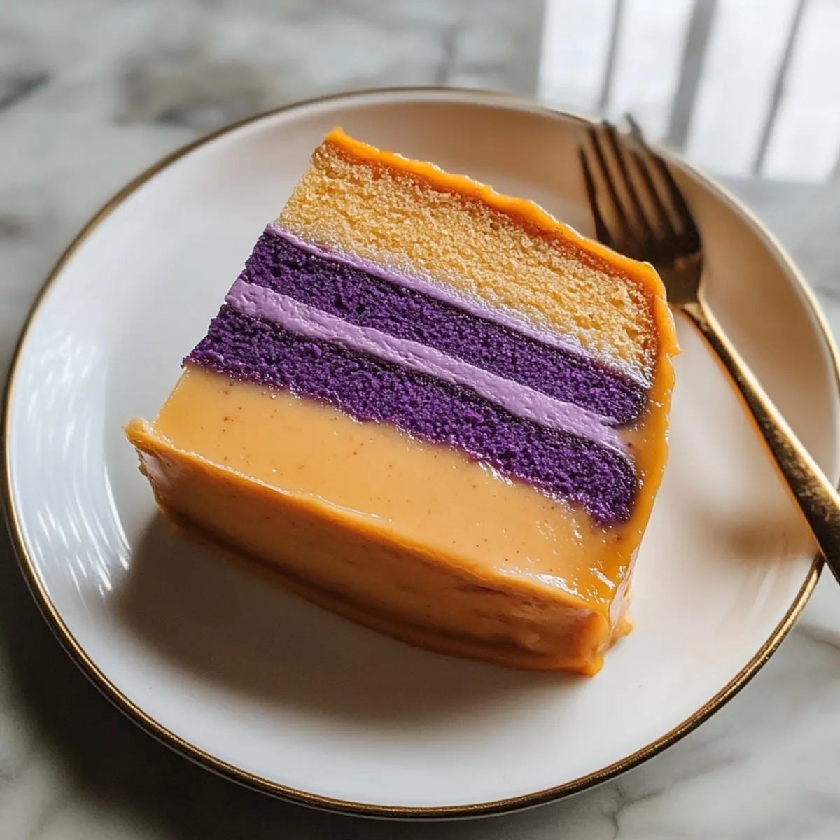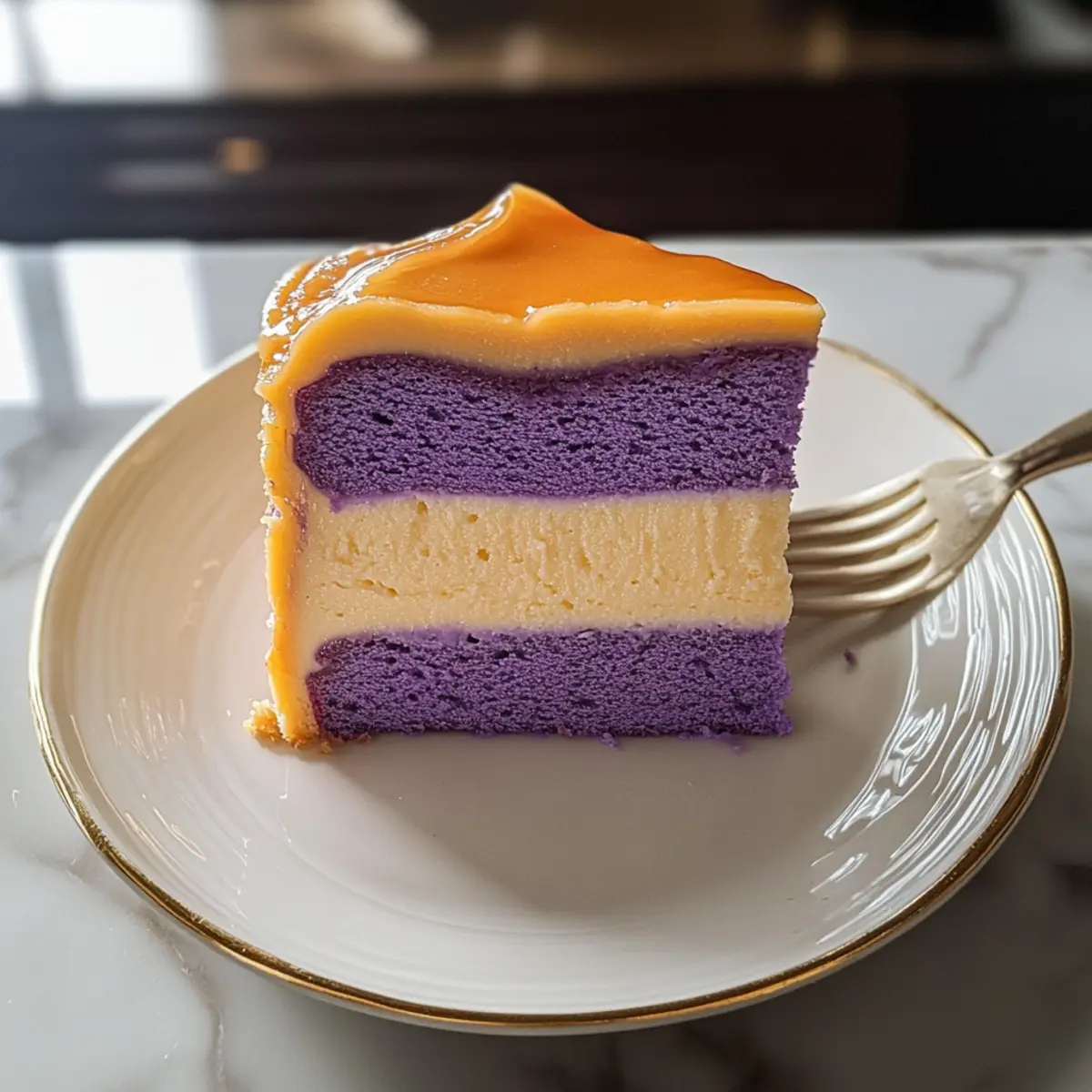 Erschwingliche Eleganz: Dieser Kuchen kombiniert Ube und Leche Flan zu einem beeindruckenden Dessert, das auch an einem normalen Tag Freude bereitet.