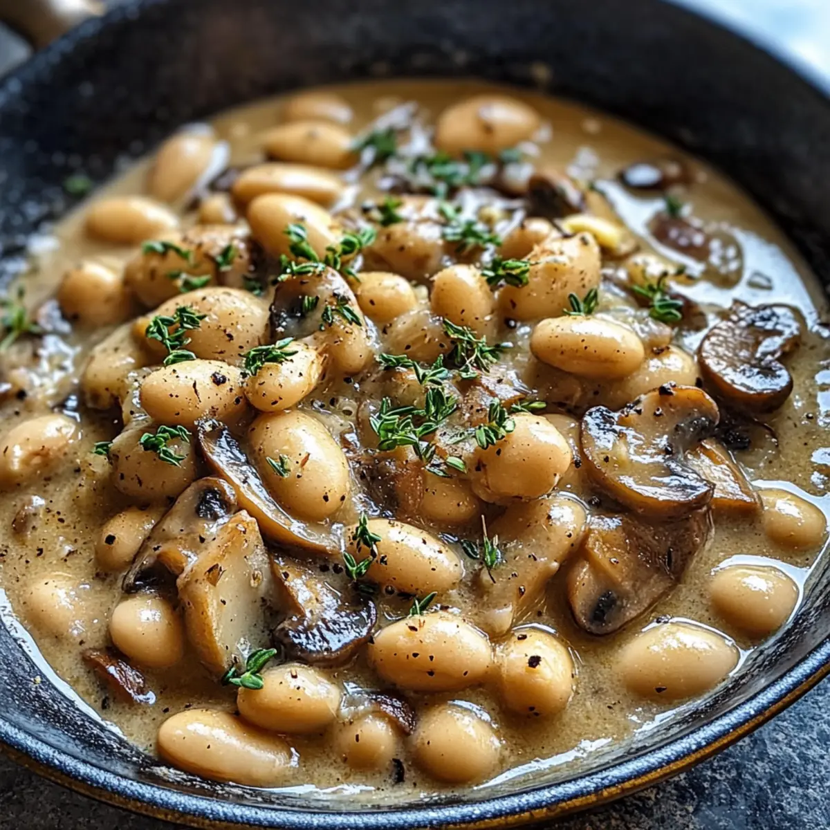 Cremige weiße Bohnen und Pilze aus einer Pfanne