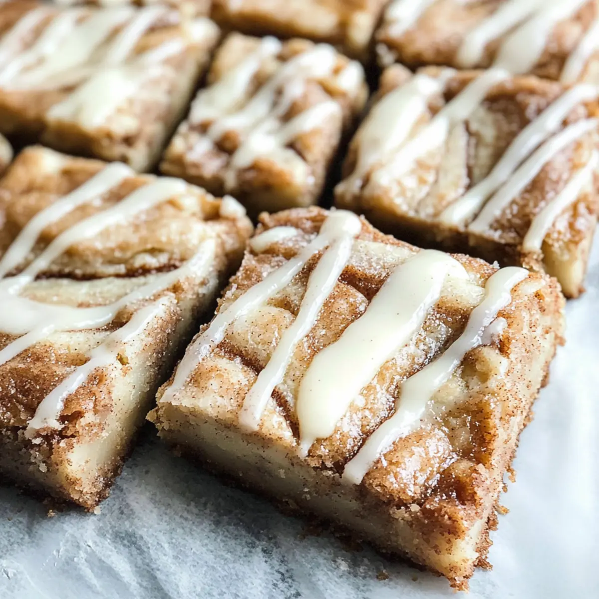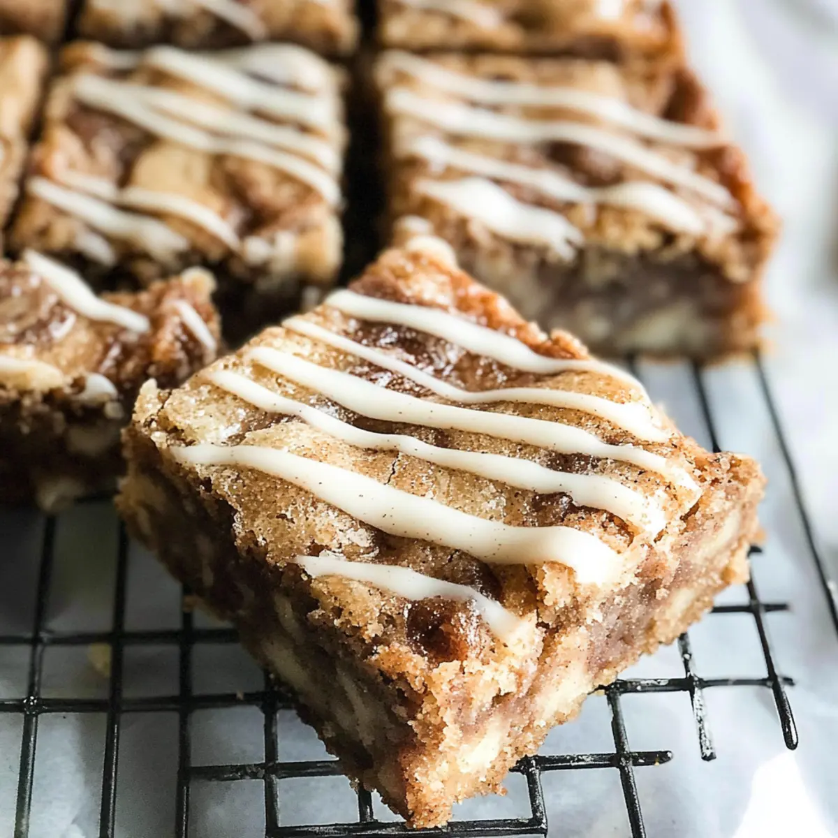 Präzises Marmorisieren: Für ein schönes Aussehen lasse die Glasur leicht abkühlen, bevor du sie über die Zimtschnecken Blondies träufelst – so behältst du die Kontrolle über die Dekoration.