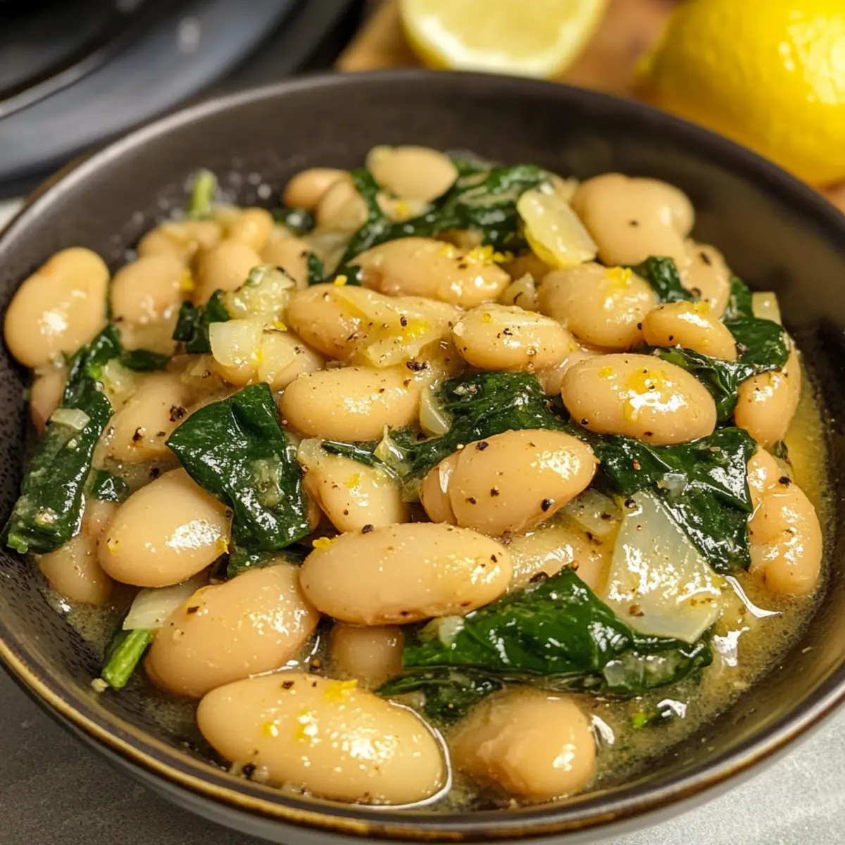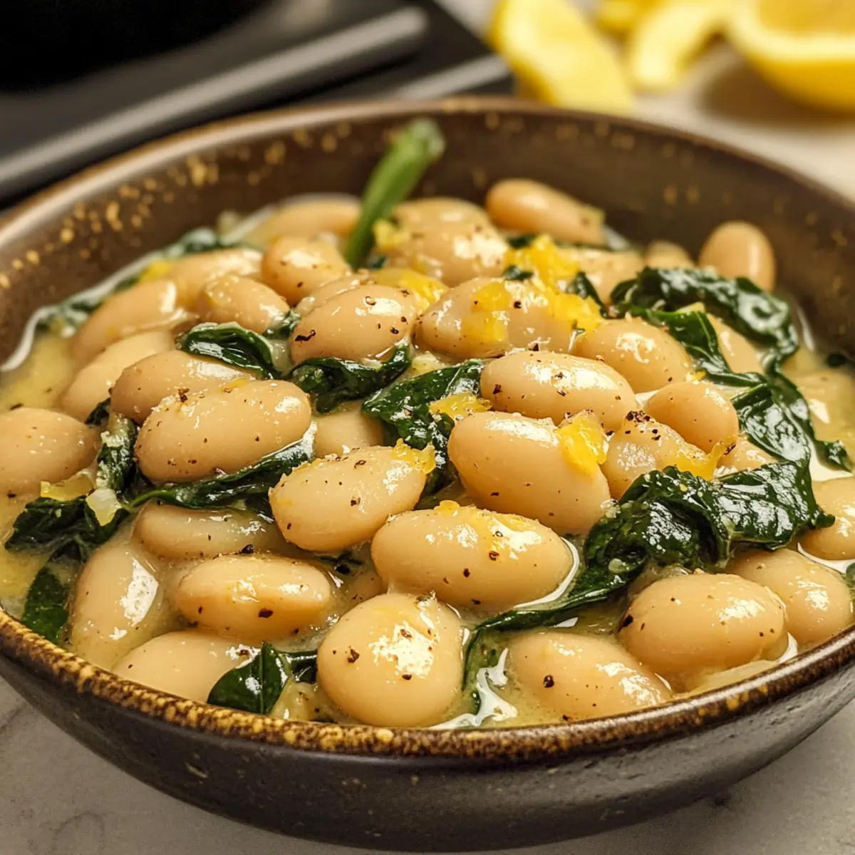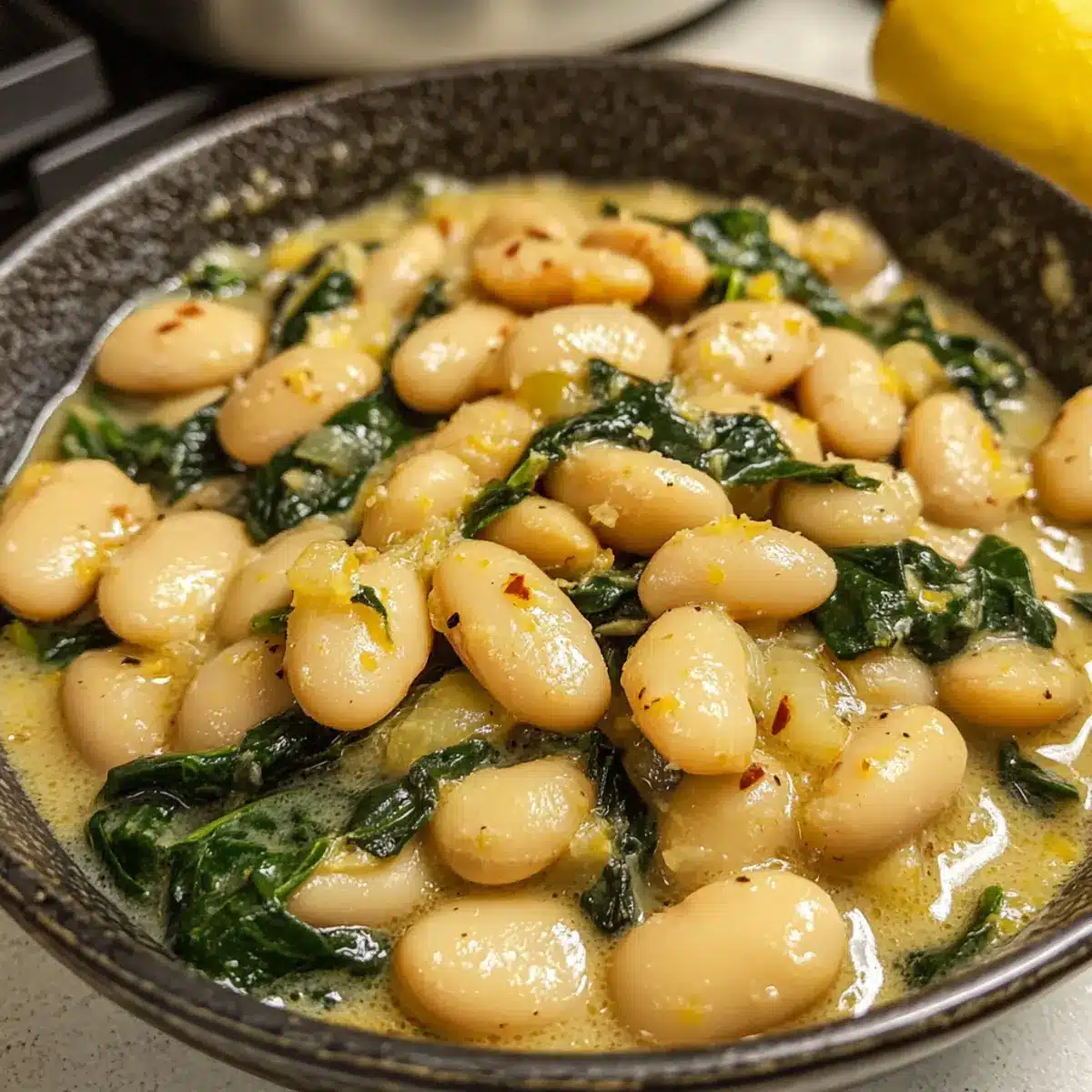Nimm den Topf vom Herd und füge den frischen Spinat hinzu. Rühre ihn vorsichtig ein, bis er zusammenfällt und gut in die Zitrone Knoblauch Butterbohnen integriert ist. Schmecke das Gericht mit Salz und Pfeffer nach deinem individuellen Geschmack ab.
